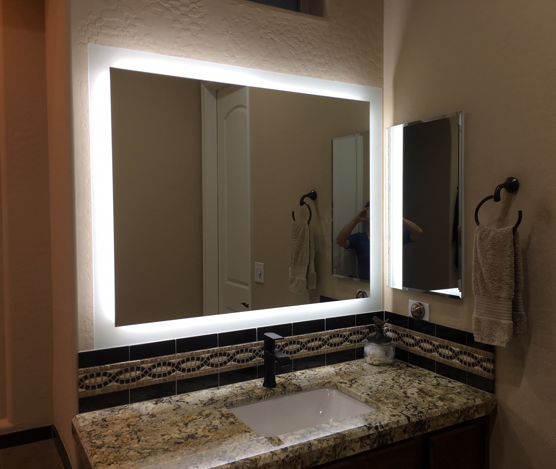 Again, the mirrors are uber bright but don’t come across well in my pics, but you can see that the black faucet works well with the new counter/sink/backsplash. For me, though, it’s not the color switch I like as much as the lower profile/more space of the single-hole faucet.