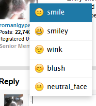 When I pick them, they don’t work anyway… they insert something like , but the actual smiley face doesn’t show up. And don’t get me started on the little menu of faces on the upper right of the typing box. I can’t see the text behind them, and the faces are so tiny I can’t tell what they are anyway. Wish they would just go away…