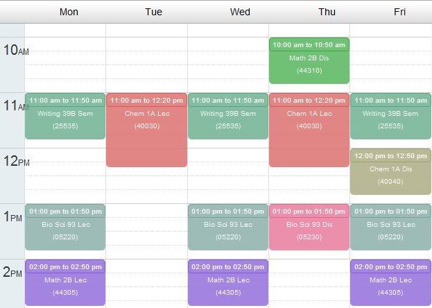<p>i am jealous. my schedule is everywhere -_- i start my lecture MWF at 8 in the morning and end around 3 ish. :[ your schedule looks nice.</p>