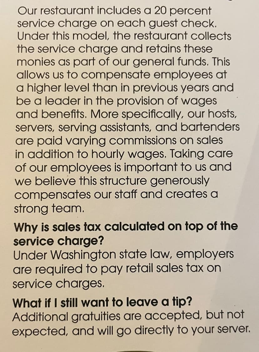 I’m trying to gift this Washington Post article, so I hope it works. It’s old but still applies in Maine, from what I’ve seen. Servers say their fear is that their tips will drop when people know they’re getting a minimum wage. “But in Maine, servers actively campaigned to overturn the results of a November referendum raising servers’ hourly wages from $3.75 in 2016 to $12 by 2024, saying it would cause customers to tip less and actually reduce their take-home income. Some cried with relief, Buckwalter said, when the final vote ended at 110 to 37 — overwhelmingly in their favor.”