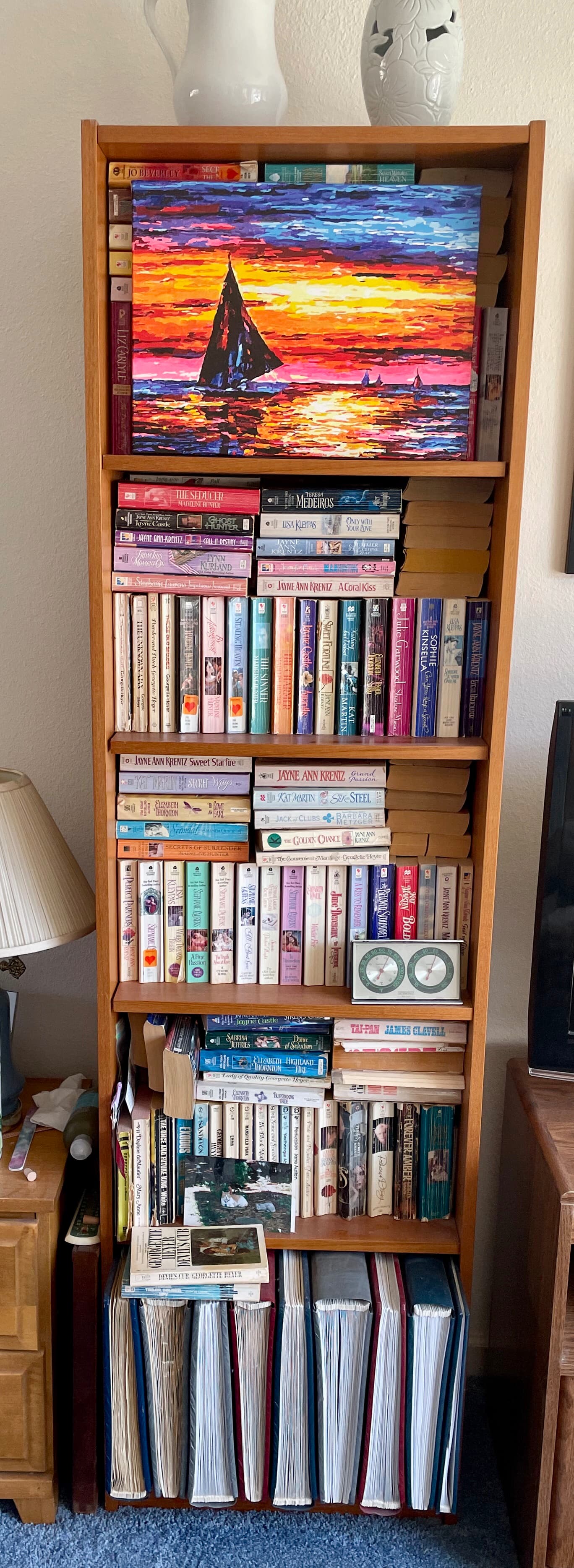 And this is my trashy romance bookcase (not all trashy; there’s a set of Jane Austen. Also every Georgette Heyer.) the books are stacked double deep. I donated as many paperbacks as I kept when we moved, mainly to the library for their book sales. That’s where most of them came from anyway.