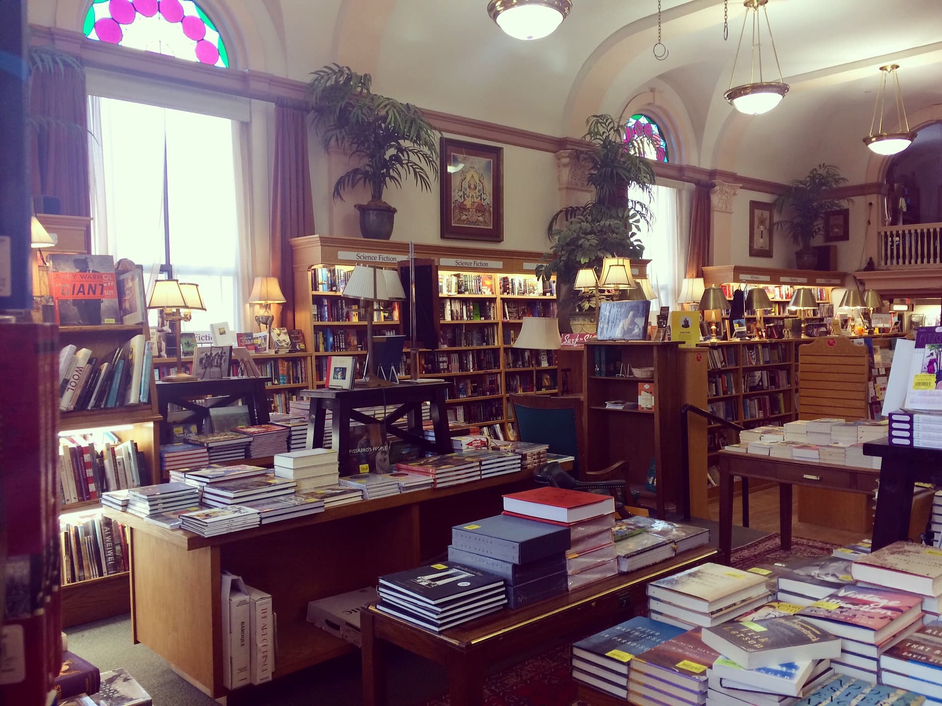 We had built-in bookcases in our old house, but we never replaced them when we moved. Sadly, most of our books are still boxed up. Instead, I’ll share my favorite bookstore haunt where I have happily spent many long lunch breaks.