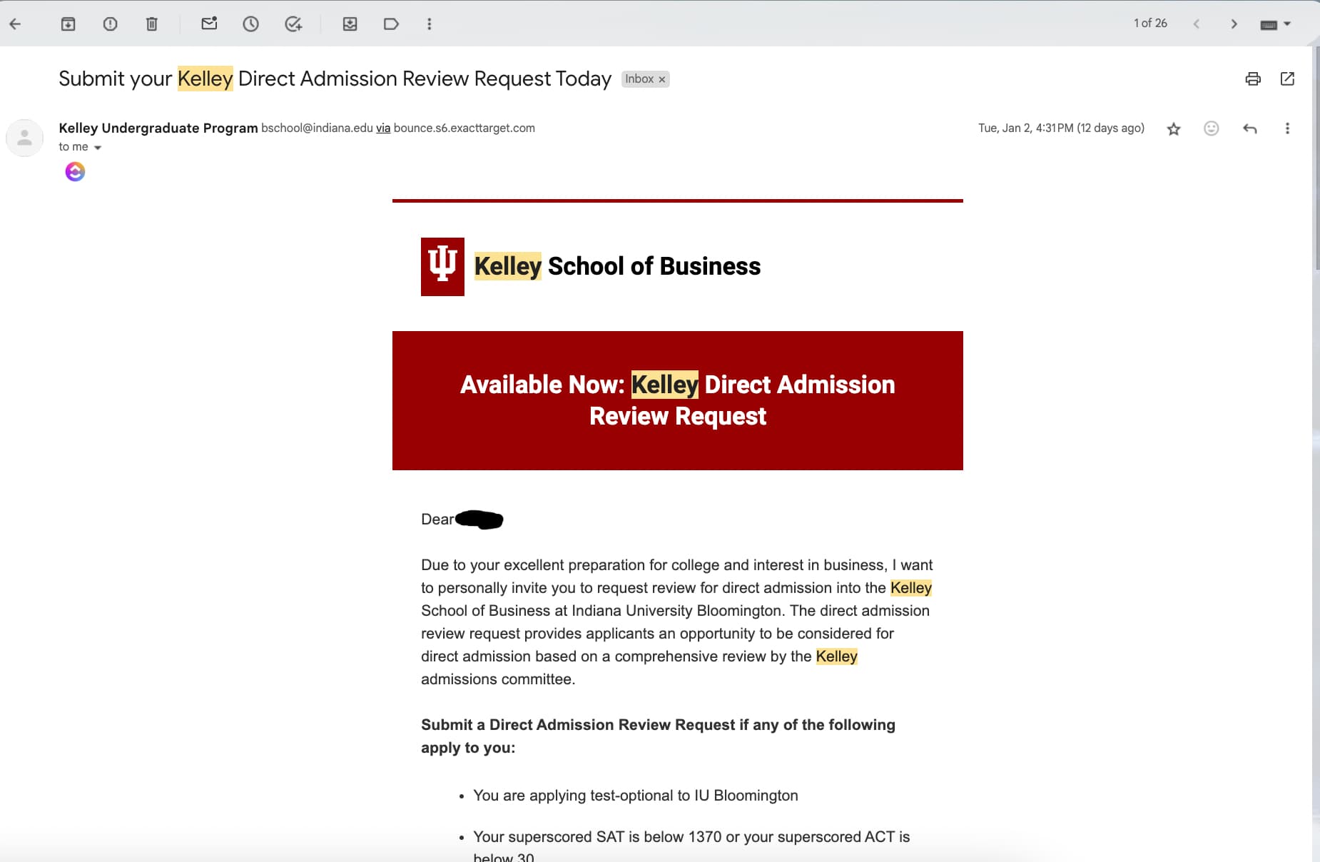 This email isnāt Kelley looking at an application and saying Wow excellent stats please submit so we can admit you. Itās our software shows you indicted business but did not submit a petition and when you call us in March to complain why you never heard - we are trying to mitigate that by reminding you to submit. People who indicate business but do not submit appeals because they do not know to submit are usually a poor yield. All Kelley sees at this point is you did not appeal but submitted business to the University and were admitted to IU.