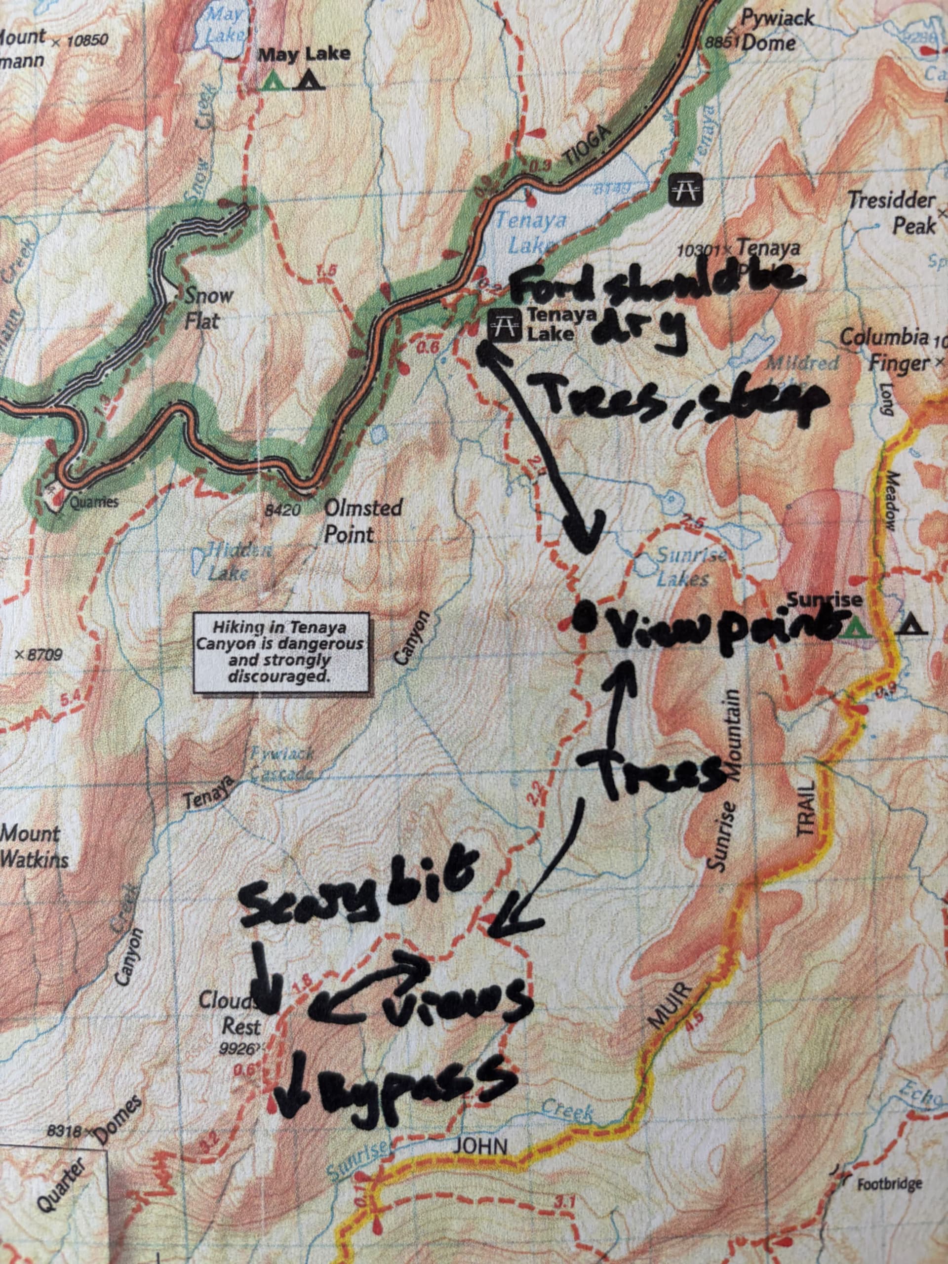 Annotated map. Sunrise Lake is lovely and only half a mile from the trail if you are running short of water or need to cool off on the way back (or give up on the way there). This time of year the trail may be dry the whole way.
