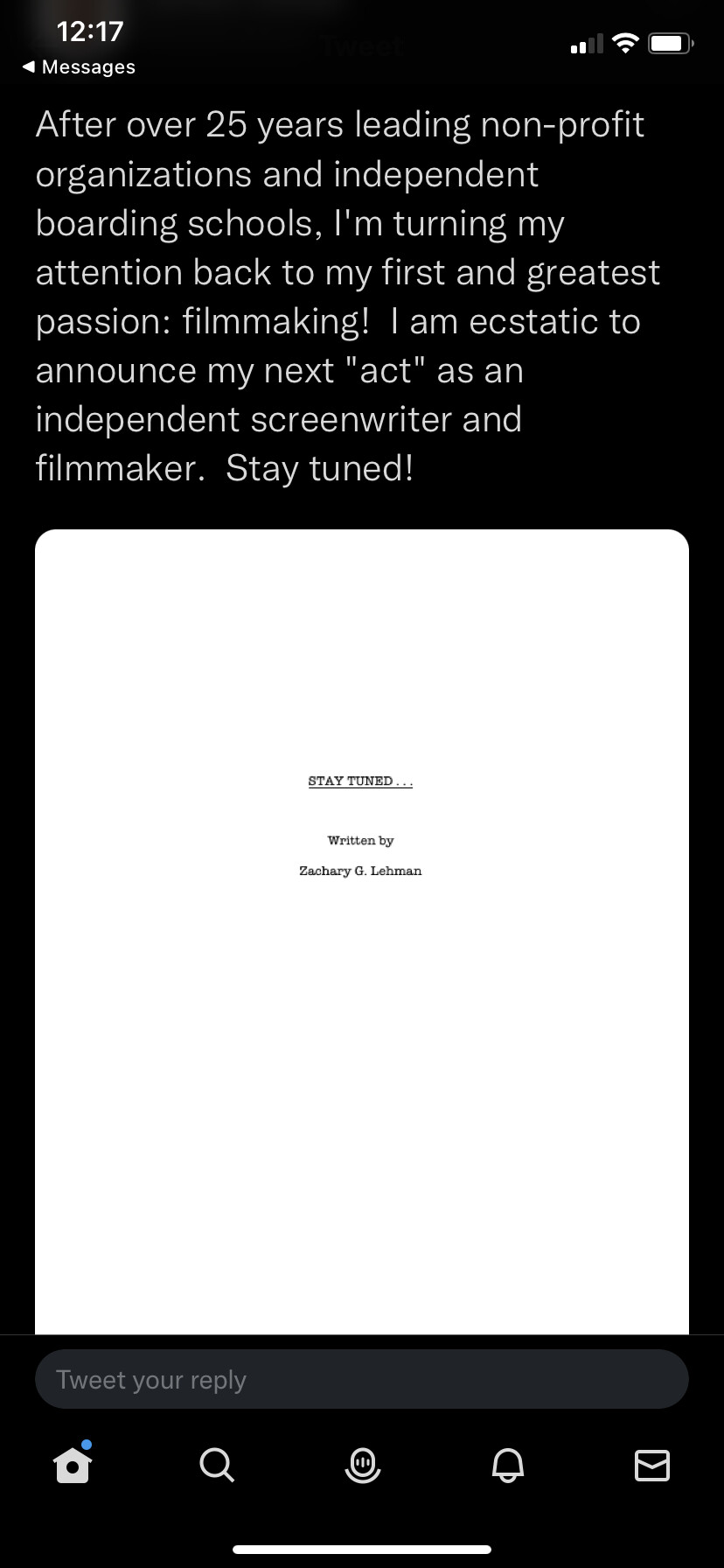 After over 25 years leading non-profit organizations and independent boarding schools, I’m turning my attention back to my first and greatest passion: filmmaking! I’m ecstatic to announce my next “act” as an independent screenwriter and filmmaker. Of course, all characters and events appearing in my screenplays and films are fictitious; any resemblance to real persons, living or dead, or real events, past or present, are purely coincidental . . . Or are they?