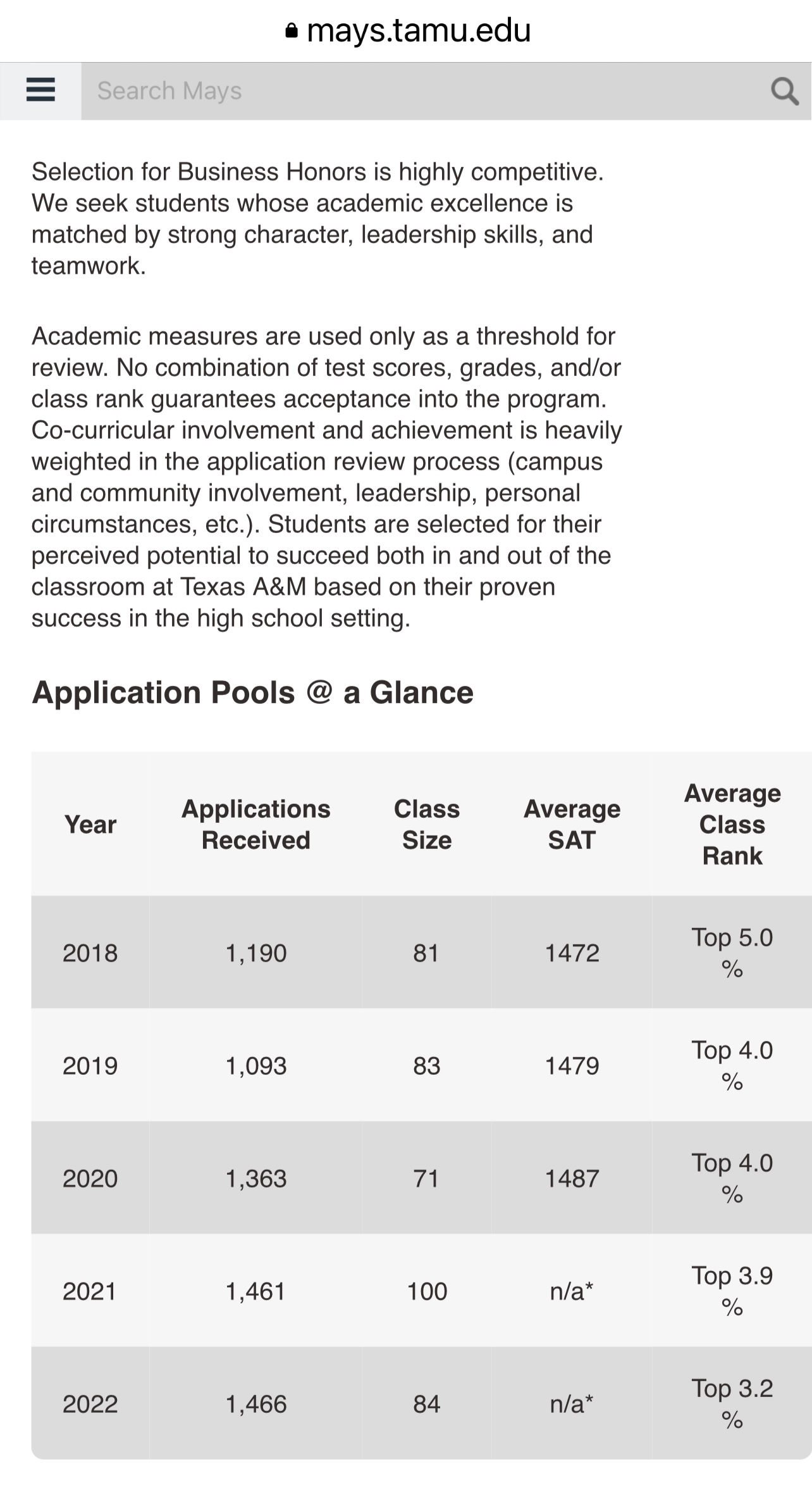 I know for certain what’s posted on Mays page isn’t correct, it’s on the ‘low end’. My Aggie was a BH recruiter one year, and there were 2,00O+ that applied that year (she saw the applicant list), but it doesn’t list that many. The stats for her incoming 2019 class was avg SAT 1510 or 1530, and graph shows lower.