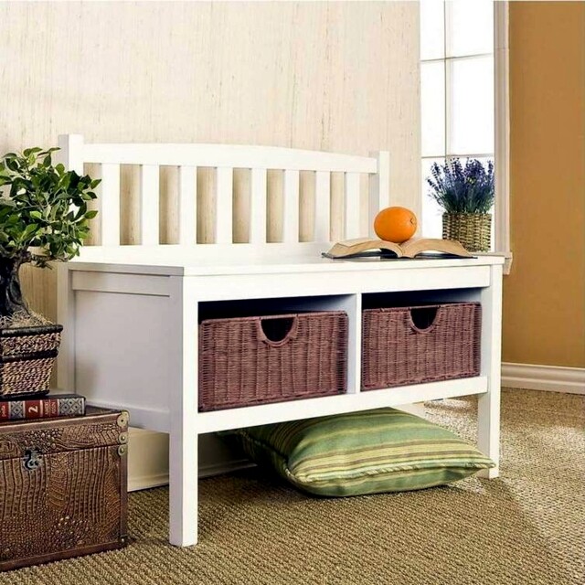 I like those benches with baskets drawers but more space underneath. That way nice dry shoes can be in a basket but any wet/muddy shoes could go on a tray underneath.