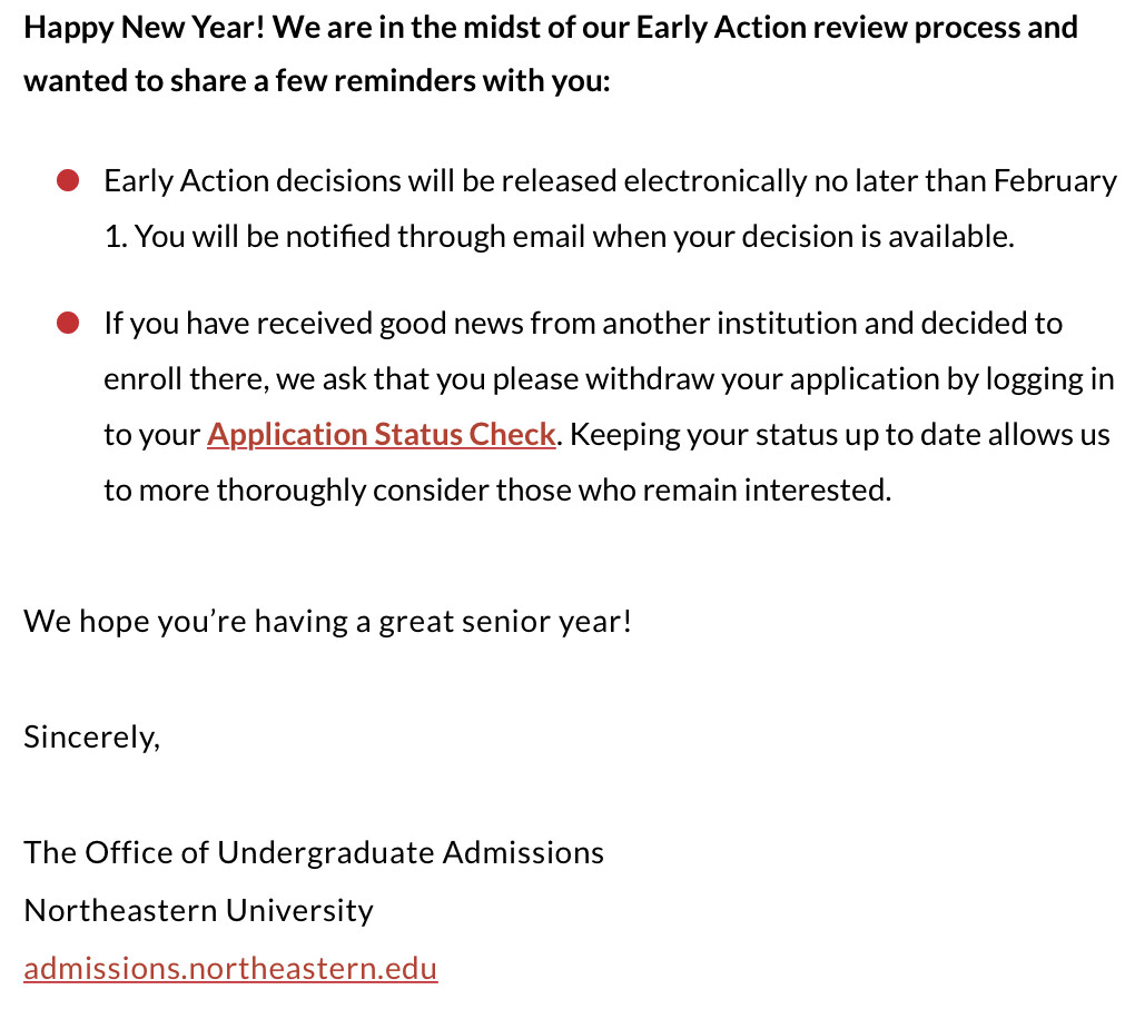 Hi, Northeastern website states that “All early action applicants should receive an admissions decision by FEB 1” , no Jan 15. Is this an inside info?
