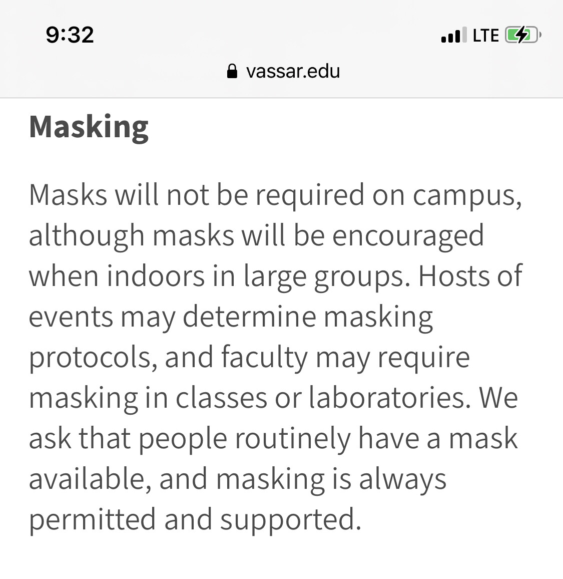 My daughter attends vassar and masks are not required anywhere unless something has changed very recently and she didn’t bother to mention it to me. We also weren’t asked to wear them at drop-off including when they packed all the parents into the chapel to hear the president and deans speak or when we carried stuff up to the rooms and helped unpack. I wonder if they have different rules for those doing tours? Because I’m not doubting you but I’ve not heard of any Covid restrictions at all at vassar (though admittedly my kid isn’t that communicative sometimes ).