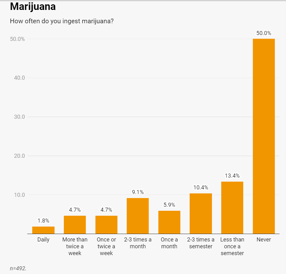Drug and alcohol use % definitely depends on the college. I am of the same mind as neela1: marijuana is a bad idea and is much more risky now than it ever was. Never have used myself and I know many many peers from back in the day (90s college) that never did either.