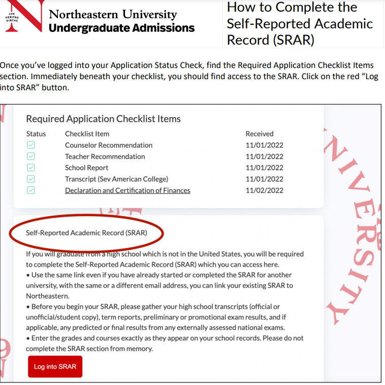 I just spoke with the admissions office at Northeastern since there was nothing in his application status about SRAR.