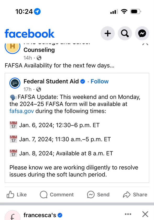 FAFSA is in! I started it on the parent side, then invited S24 to complete his part. Sat with him while he did it. After he completed everything, there was nothing to click on to submit. So I logged in myself, again, even though I had gotten an email saying my part was done… And had to reconfirm all my info (at least it was already in there from before). Once I did that I was able to review and submit!