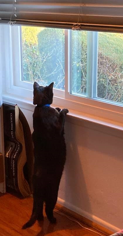 My D’s cat, Kona, has a bunny friend that comes by and sits outside the window nearly every early evening - Kona and the bunny seem to have conversations I’m not privy to. I need to get a pic of the two of them, they hang out for long periods of time at the window (Kona has a hammock at the window and usually has her tush in the hammock and her front paws on the windowsill). This one is Kona looking to see if her bunny friend is there yet.