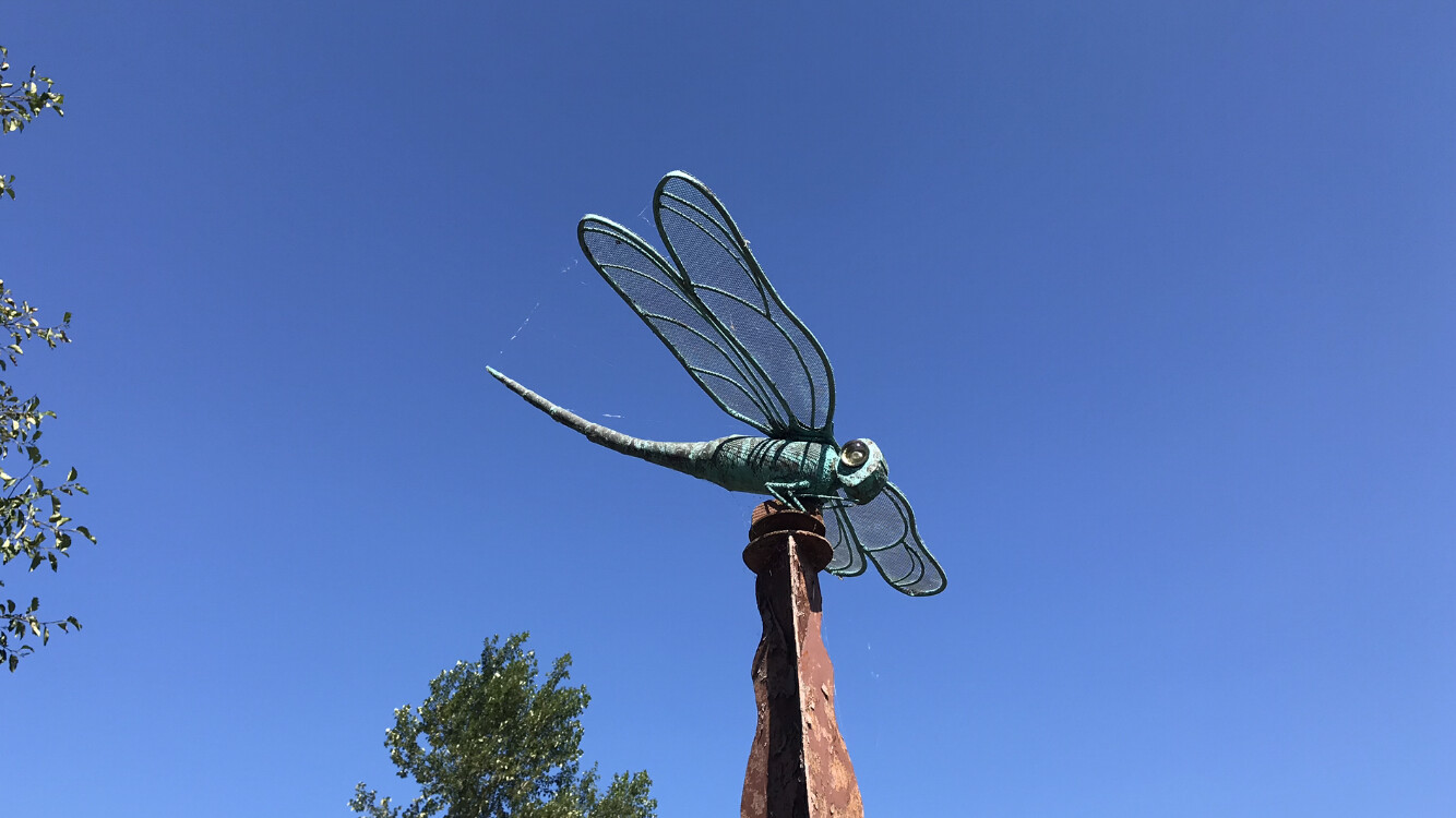 Tasting wines in ‘Ville. The dragonfly that has been guarding the bridge is still keeping an eye on the foot traffic crossing the river.