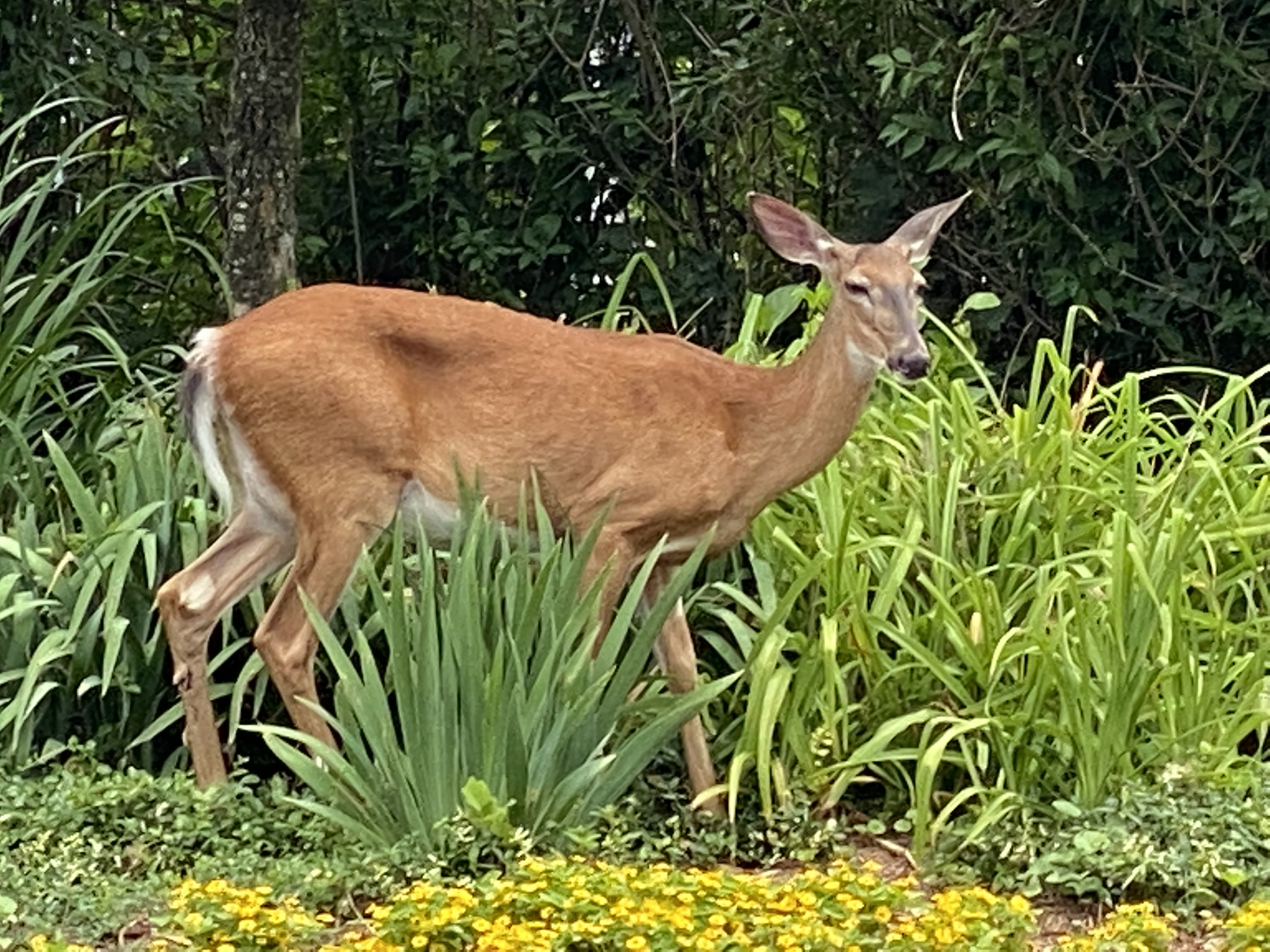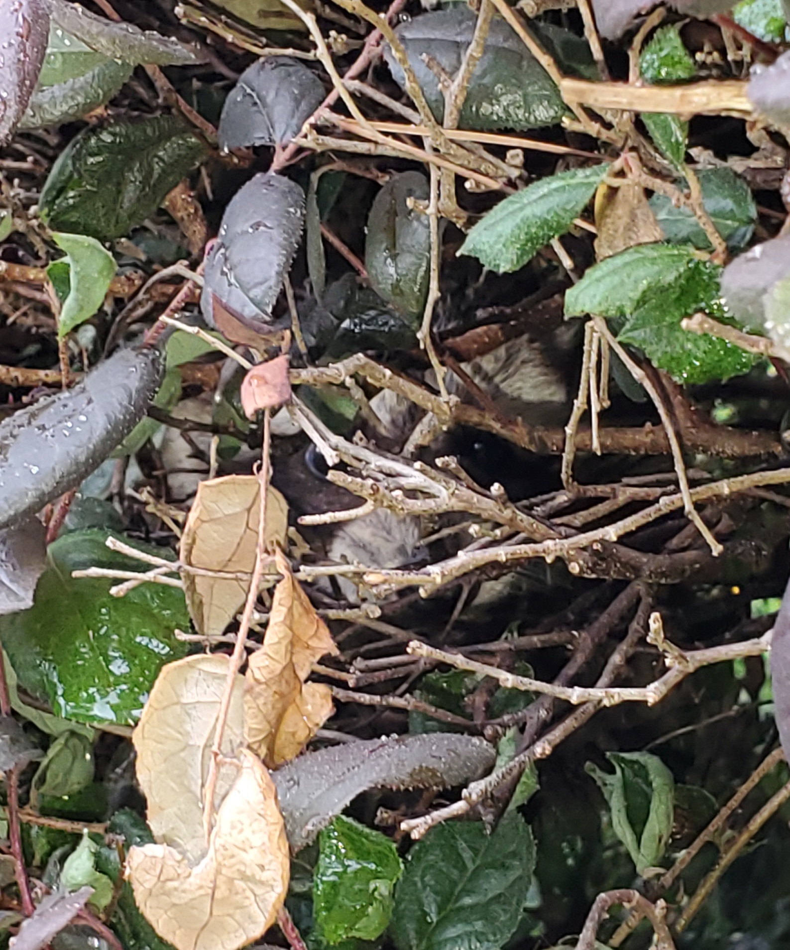 Look closely and you can find our baby racoon. It was dropped by a hawk this evening and landed on our shrubs. We’re waiting for a wildlife rescue to come get it.