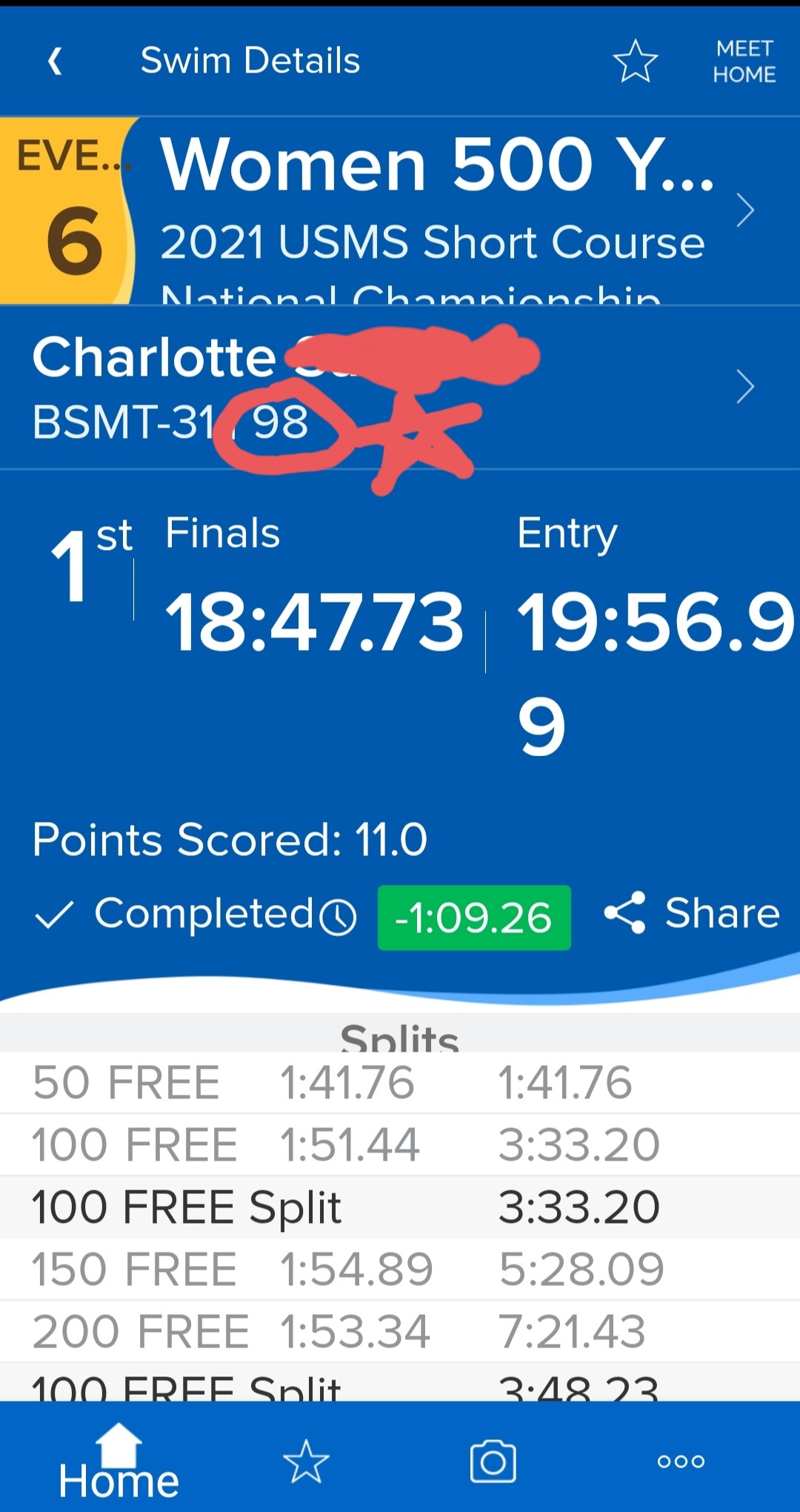 Ok, this is actually a screen shot, but I was so amazed by her determination that I had to share. DH and I have been involved with USMS (US Masters Swimming) for years and were watching results come in from nationals when I saw this. Her age is circled in red, truly inspiring.