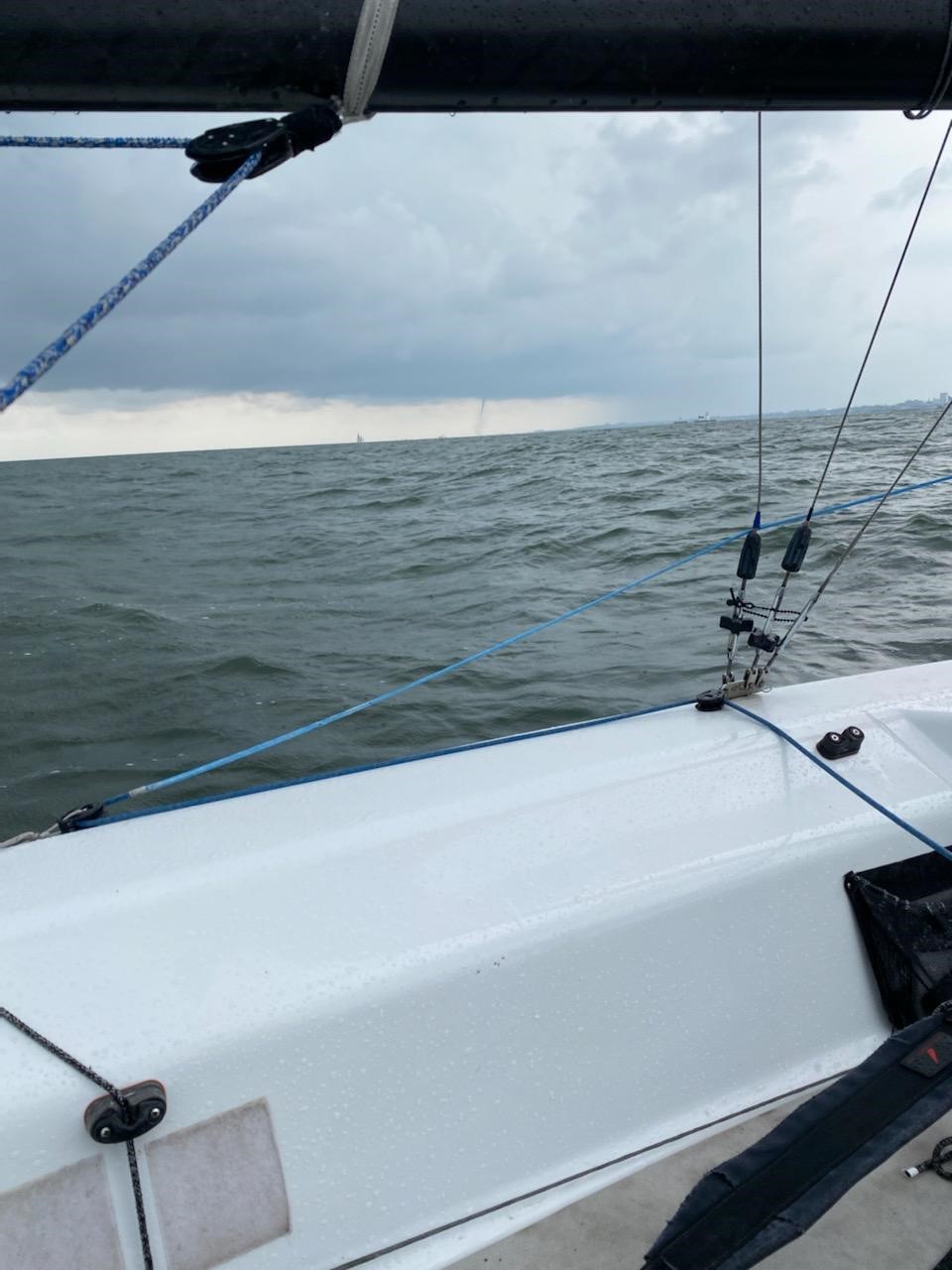 About 10 mins after pics were taken, rain started. About 15 mins after that we had flipped the boat twice (second time turtle) and couldn’t right it. Was friend’s third time on this type of boat (VX) and my first. Race commitee boat stayed with us and another group who were sailing in our fleet (who had a ton more experience with this kind of boat) took their boats in and came back out in a power boat to provide assistance. Looking forward to sailing the boat again. Learned a lot that day.