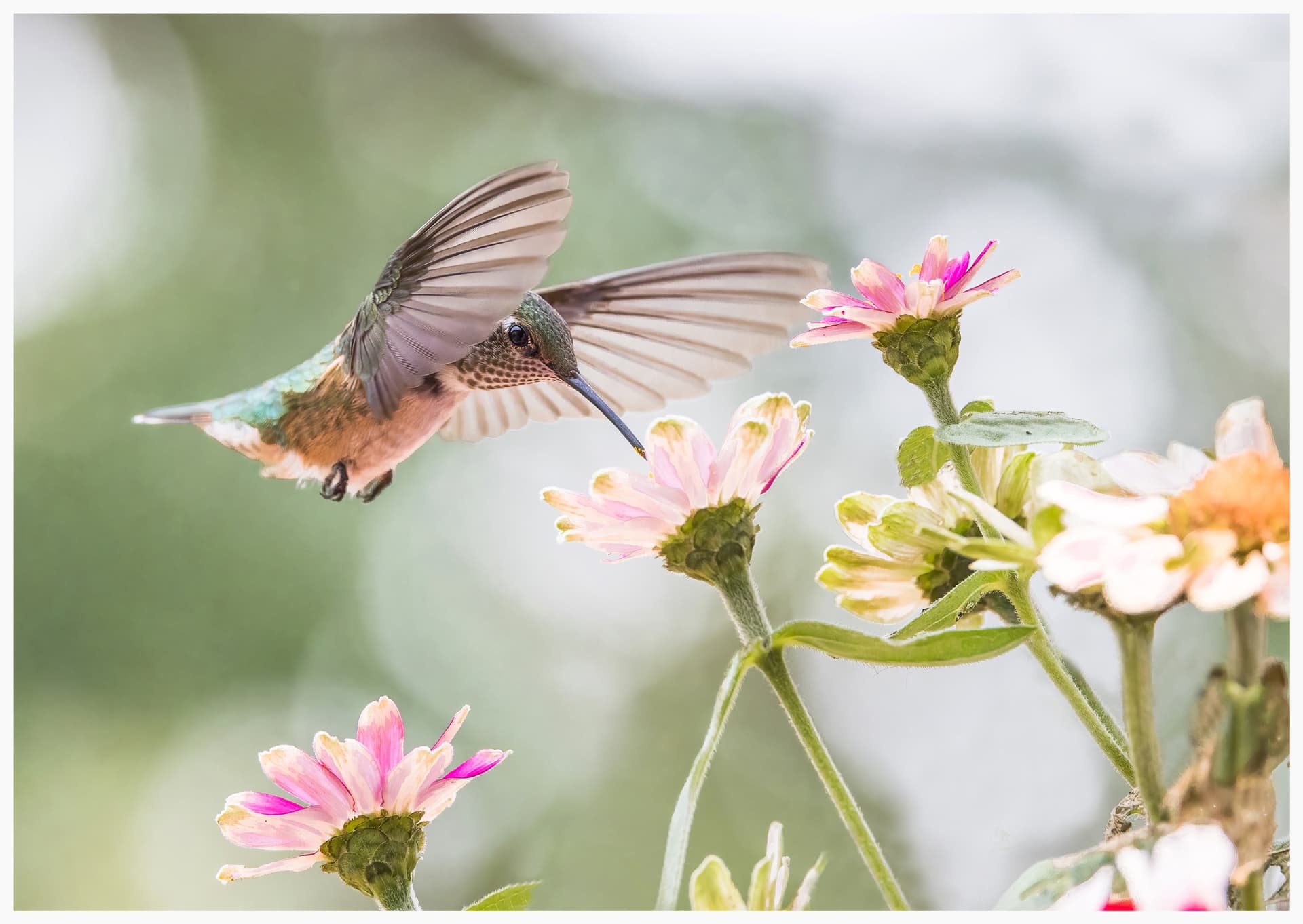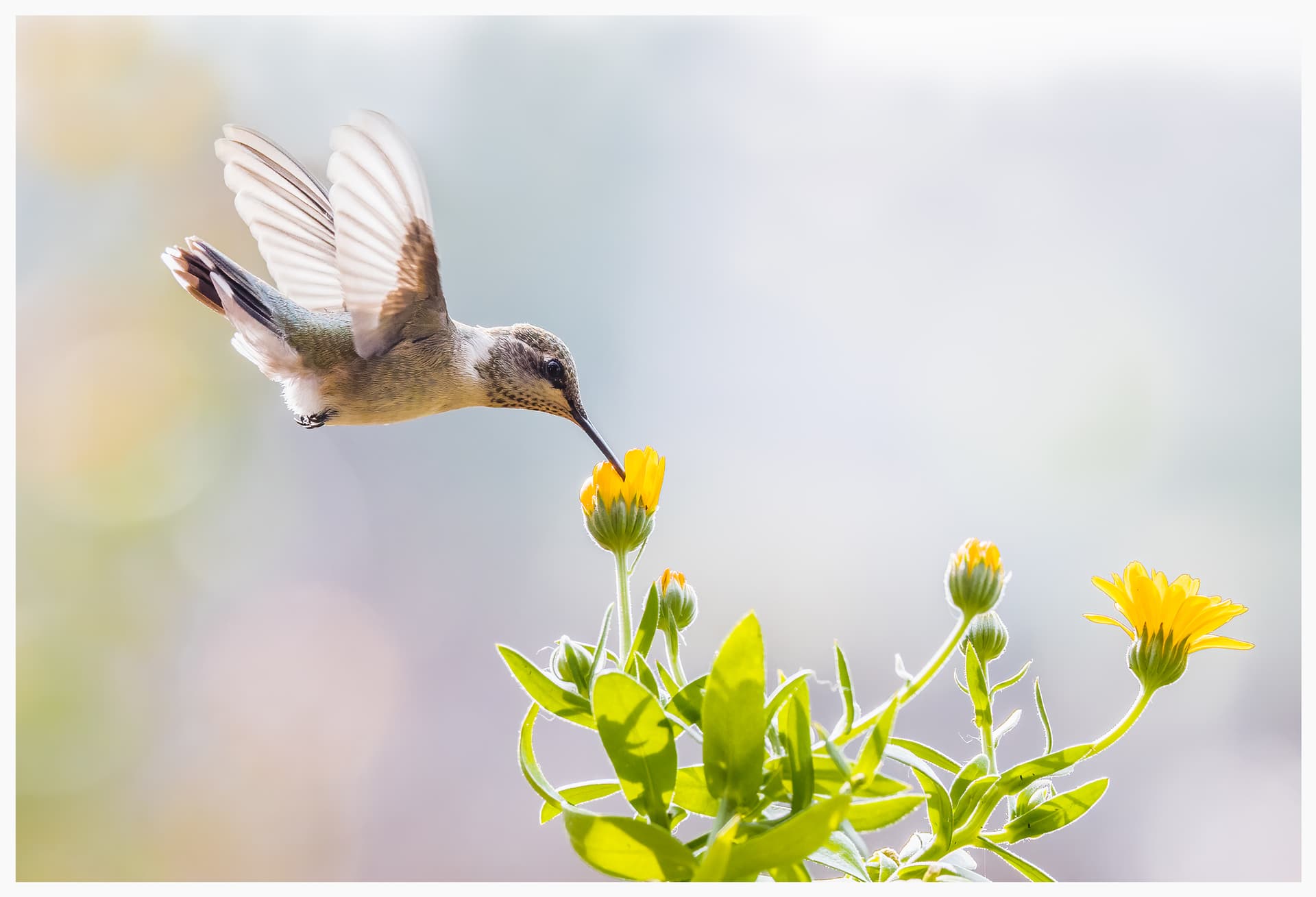 Hummers tend to drink, pull back, drink, pull back, so one of the techniques I use is to simply time my shutter to when a hummer pulls back and hover. For this reason, hummers don’t really require a very fast shutter speed. Since they’re “on plane” with the nectar source, I pre-focus my camera at the source to begin with, so the camera focusing system doesn’t go bonkers. If you have a nice light when shooting hummers, using a narrower depth of field, say at least f/9, and shutter speed of 1/2500sec, you should be able to capture them successfully.