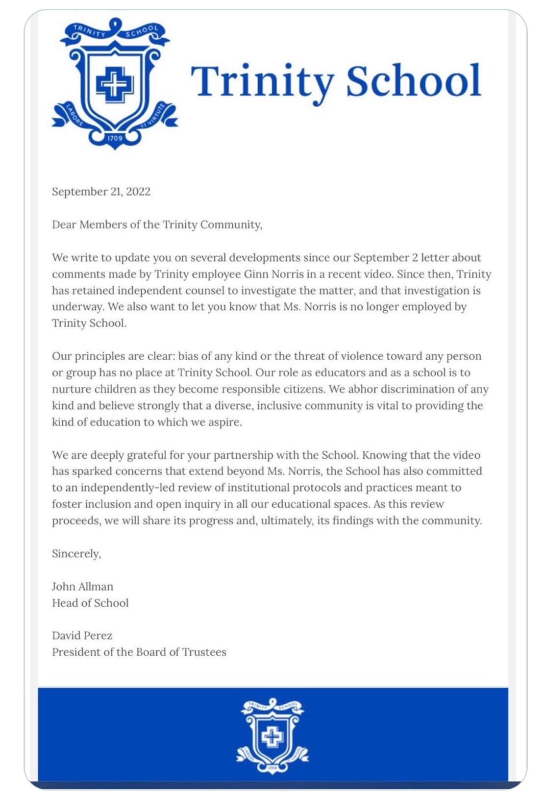 Not long after the video appeared, however, the director was left to bring none of herself because Trinity put her on paid leave pending an investigation. A few days later the head of school, along with the president of the board, sent a letter to the community calling the practices and values conveyed in the video “anathema to us and contrary in all ways to our commitment to be a place of inclusion, belonging, and open inquiry.”