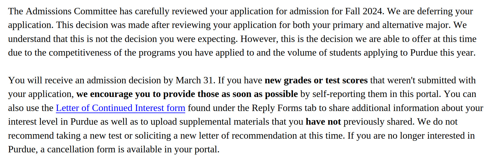 The College of Agriculture which houses the Landscape Architecture major just announced a new Spring Start program (Spring Start expands opportunities for Purdue University agriculture students). My son who got deferred for Biological Engg in the same college is also automatically being considered for this. The press release is short on details, but personally this looks interesting to us as it could mean two shots on goal (Fall '24 admittance with decision by 31st Mar and Spring '25 admittance with decision in Feb). Purdue is his top pick. We are also submitting LOCI and 1st Sem grades soon. Good luck!