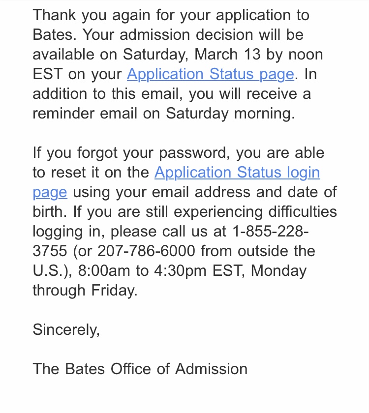 Bates College sent out an email confirming decisions will be out Saturday, March 13th by noon EST