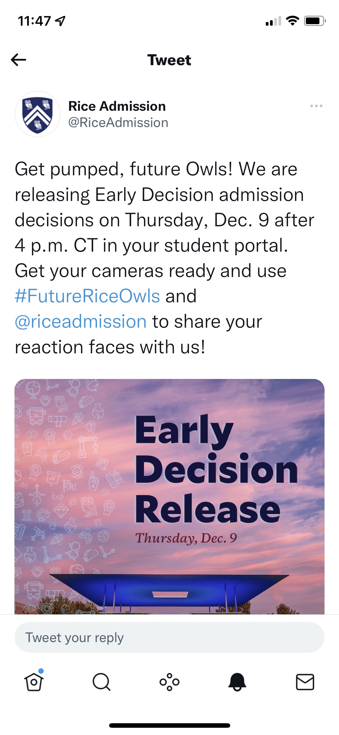 My daughter immediately fell in love with Rice at first sight. Weād visited a few other public universities with tens of thousands of students and we both knew that sheād thrive better in a smaller campus setting. So applying ED to Rice University was her 1st choice.