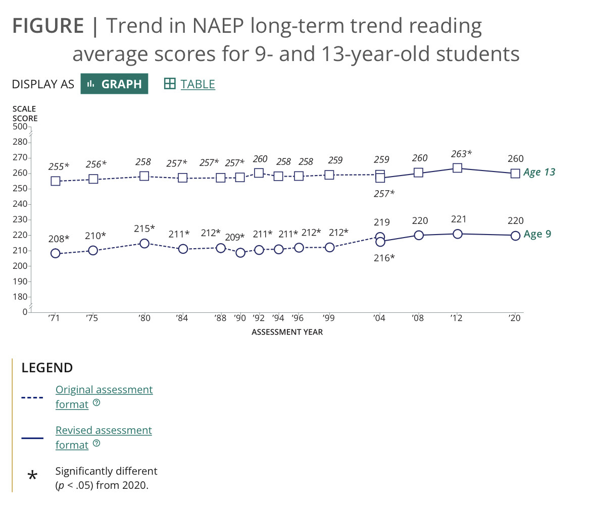 Do not flame me but what standardized test is used for this assessment graph? Also what are the parameters being tested? Are all of the test formats the same from 1971-2020? What is original vs revised?