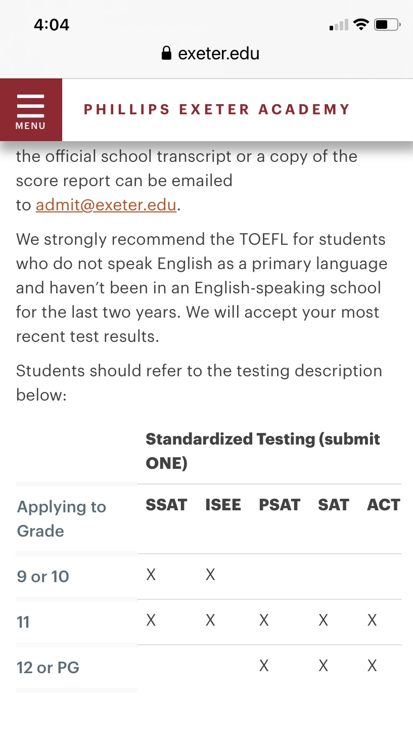 Exeter’s web site lists which tests for each grade are accepted. You could always submit them as additional materials. When my kiddo applied last year for 11th she used SAT, PSAT and ACT. But all of the schools she applied to required those other ones for grades below 11.