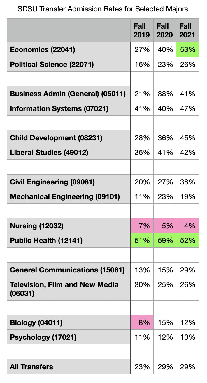 The overall transfer admission rate at SDSU has been 23%-29% over the last several years, but it varies from major to major.