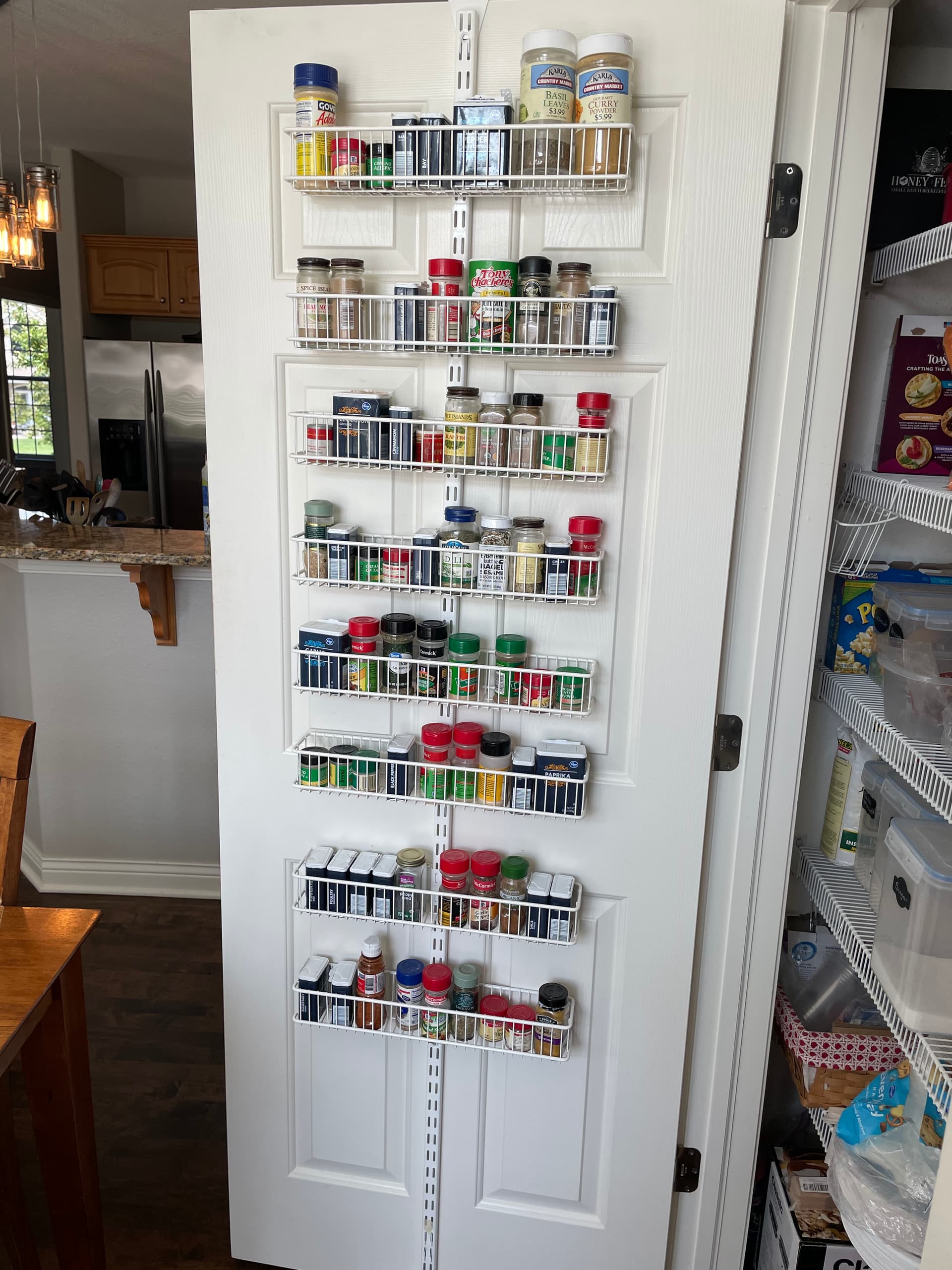 I have something similar (but not as pretty as that wooden one) from The Container Store. It’s basically a rod that hooks on the top and bottom of the door and then you buy baskets to store your spices that fit into the rod. I like it because you can customize the basket sizes you want though mine are all spice sized. Then my spices are losely alphabetical.