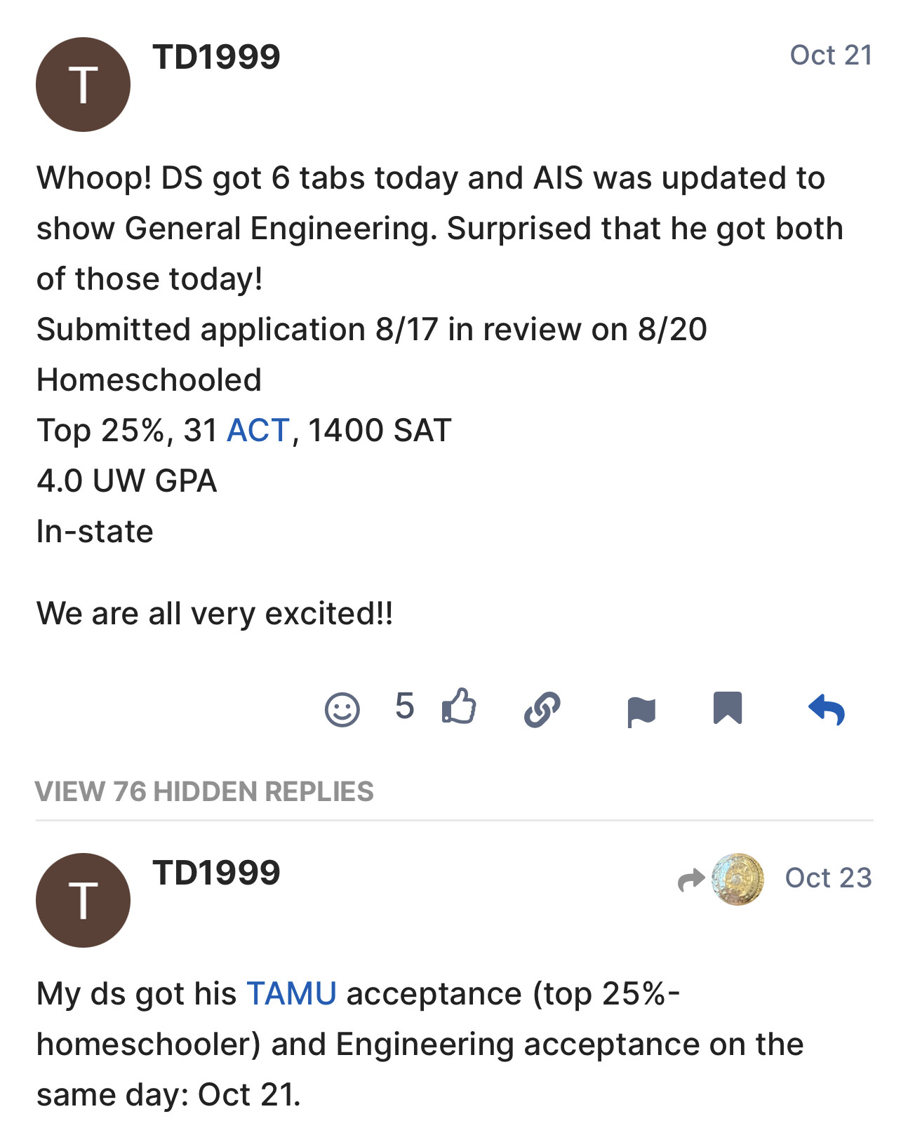 @TD1999 - my daughter applied 1st week of August as well, but didn’t hear back until Dec. 3. Your DS must have had excellent test scores to receive acceptance so early. Without academic admissions the past two years, homeschool and private school kids really need to have great standardized test scores plus great ECs to compete with top ten public school students. My DD would have most likely fallen in the top 10 if she had continued with public school and she ranked 1st in her small private school. She’s remained close to her ps friends, several had lower scores yet qualified for top 10% and we’re accepted to TAMU early. We celebrated their success with them and as we kept waiting for her acceptance. Texas is a very homeschool friendly state, but when it comes to college admissions, families need to be prepared for the holistic review process and a bit more waiting if you don’t have exceptional test scores.