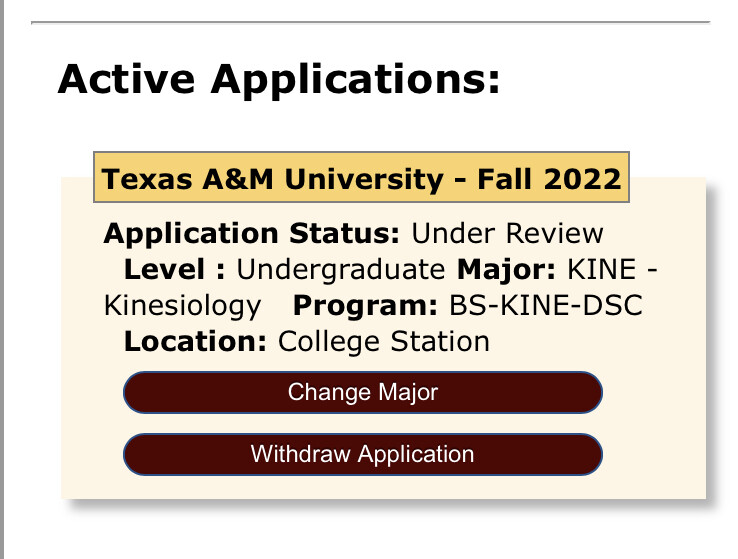 @ChristiR93 – First of all, thank you so much for all of your insight on this board. I’ve been following for months, and you’ve been a great source of information and positivity! We checked the Howdy this morning, and it changed for us. No 7 tabs, but the “change major” option is gone in both AIS and Howdy. Now Howdy has the following: Application Status: Under Review Level : Undergraduate Major: USLA - University Studies Program: BA-USLA-SEL Location: College Station. We applied as University Studies and it has always shown up exactly the same way. Any thoughts?