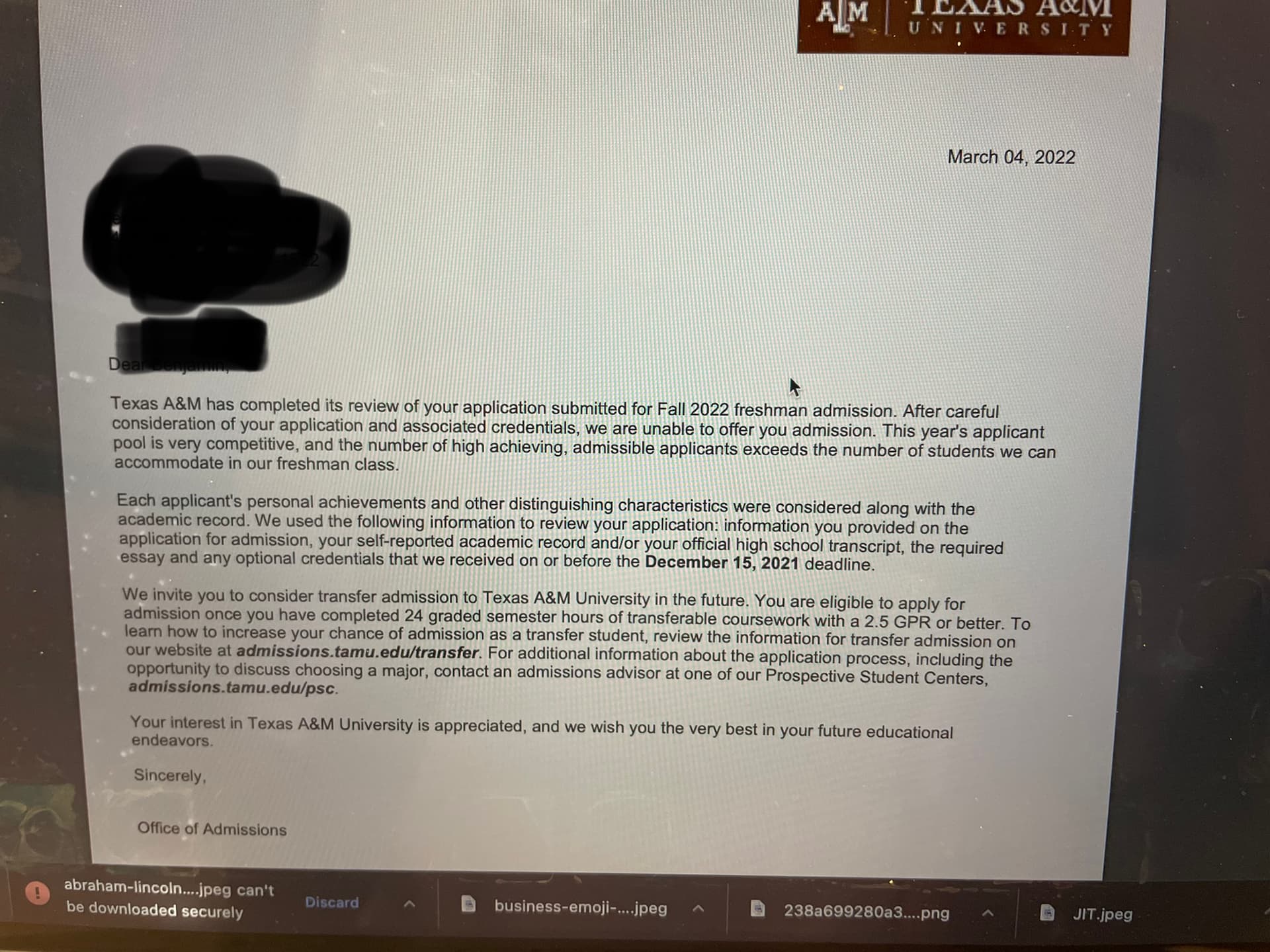 Without knowing his/her application details, it’s highly possible that it was not complete. Can’t tell if that’s a physical letter or one pulled from his Documents in AIS - just curious if he had all green checks on his checklist. @ChristiR93 Don’t you agree that TAMU usually rejects for this reason?
