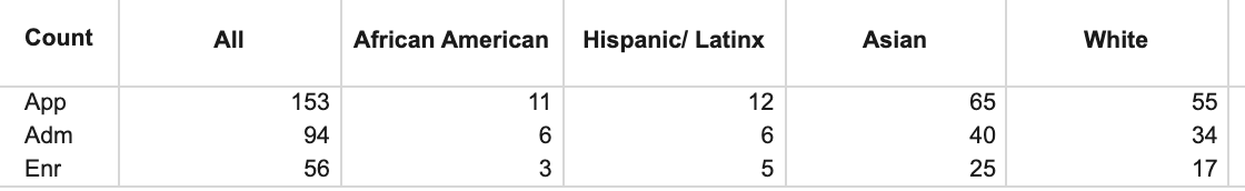 Well, we can easily look at the UC and isolate that, at least for in state schools. I can take my daughter’s high school as an example, but you can try it with any high school, using any admissions year (so you can pull quite a bit of data - below is just a fairly random sample of one high school and two admissions years, one before and one after the change in testing policy):
