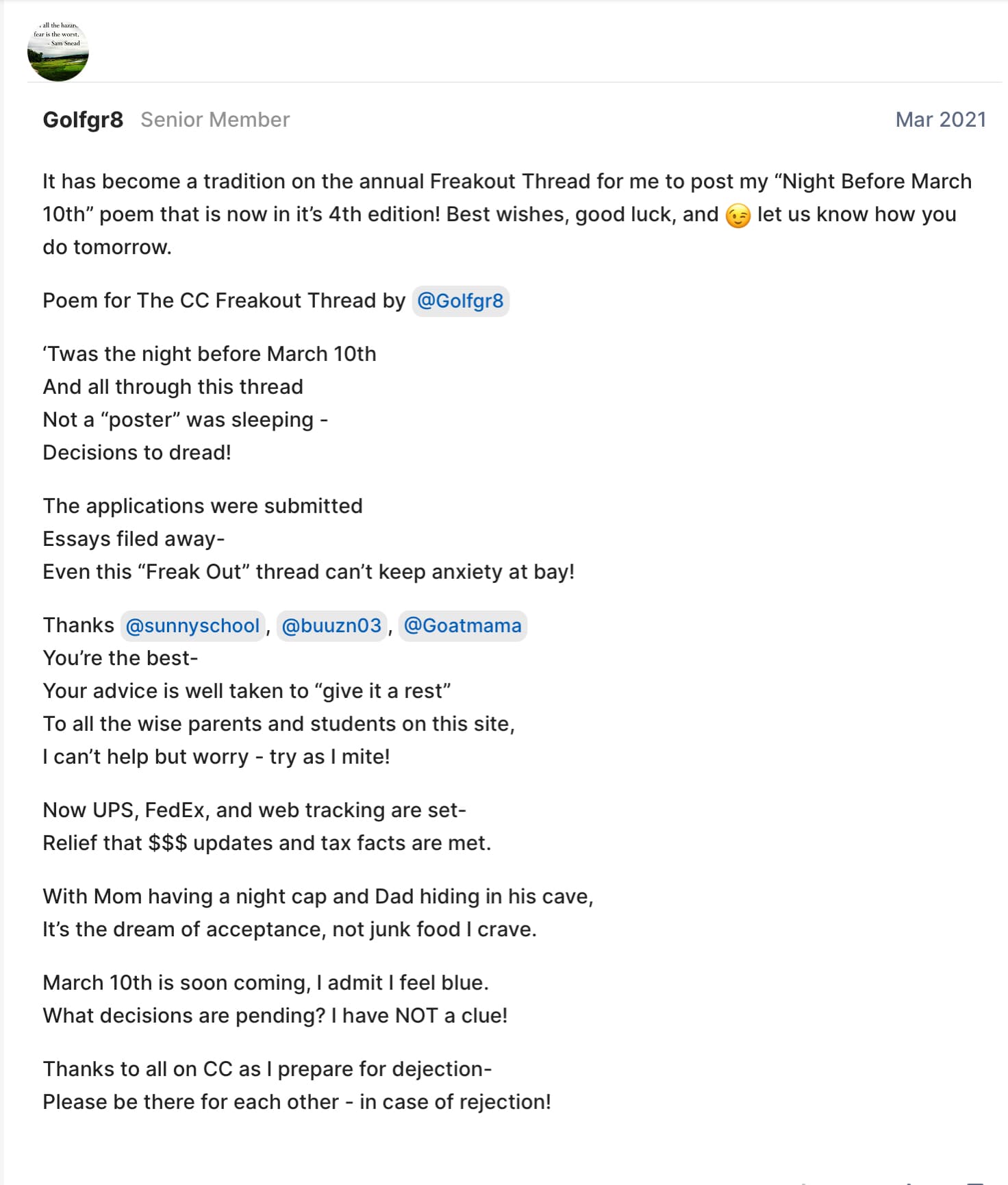 My daughter is an athlete who plays both school and club and her coach was asking her for input on her club teammates who are applicants as recently as Sunday night. So when they say decisions come down to the wire apparently they truly do.