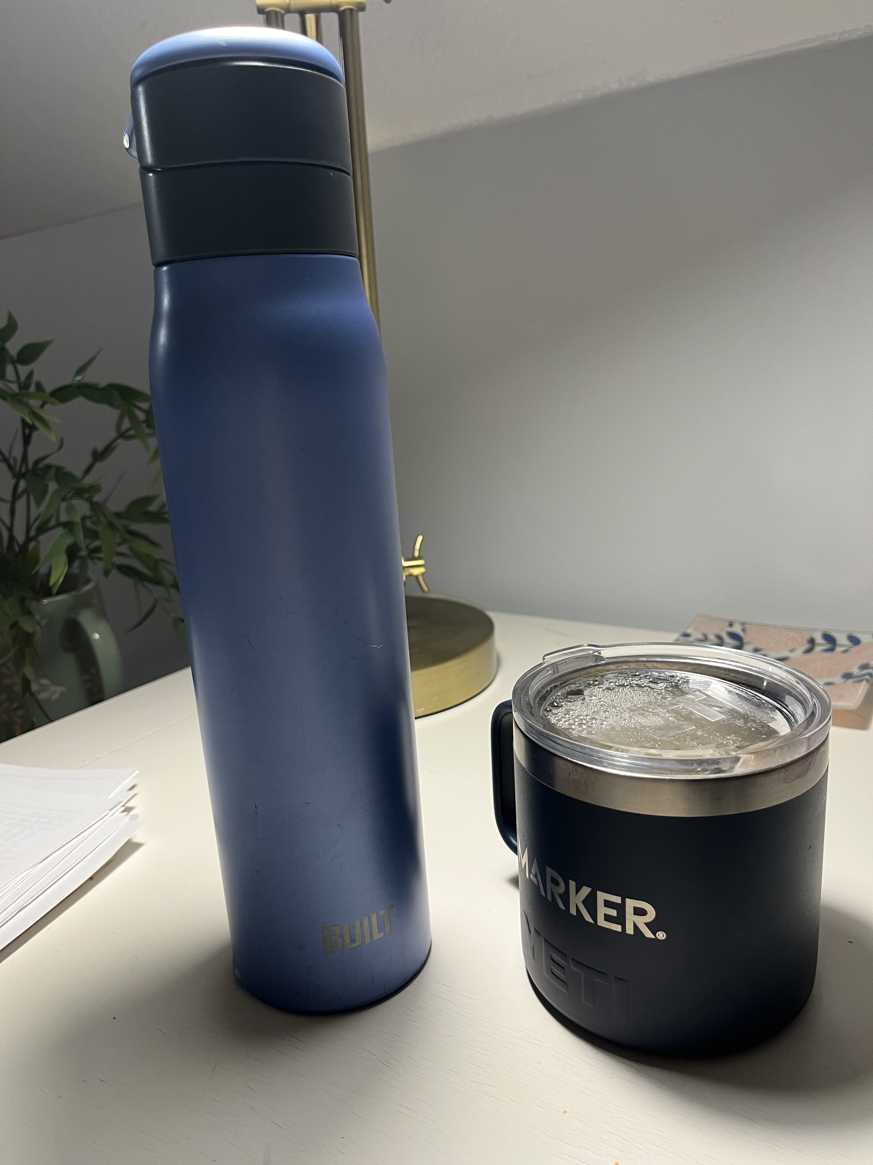 Here’s my current daily set up. My water bottle is BUILT. Will keep ice solid all day long and even keep cold in the car in summer for hours. The YETI I bought at a thrift store, new with tags for $1 - has a corporate name on it so someone just never used it