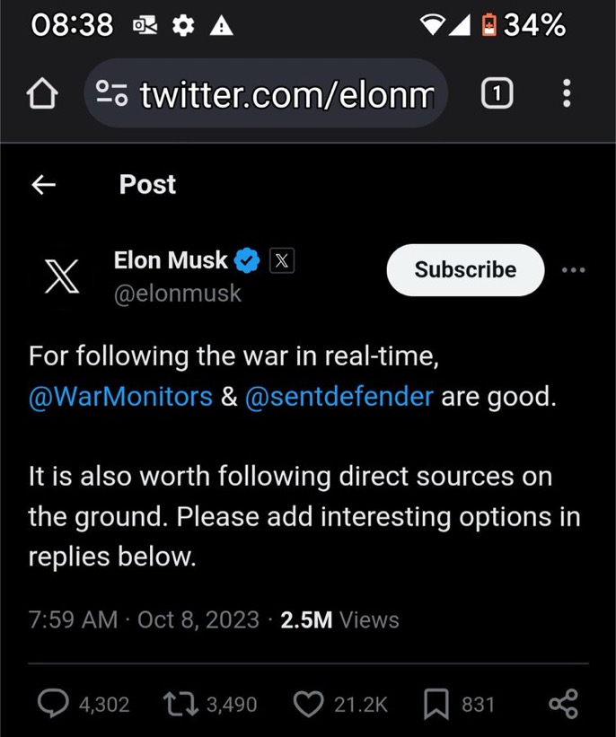 And for “balance” Musk’s advice with respect to the Hamas terrorist attacks is to follow an account (WarMonitors) that refers to Israel as “the Zionist regime” or “the Jewish terror state”
