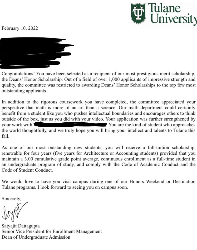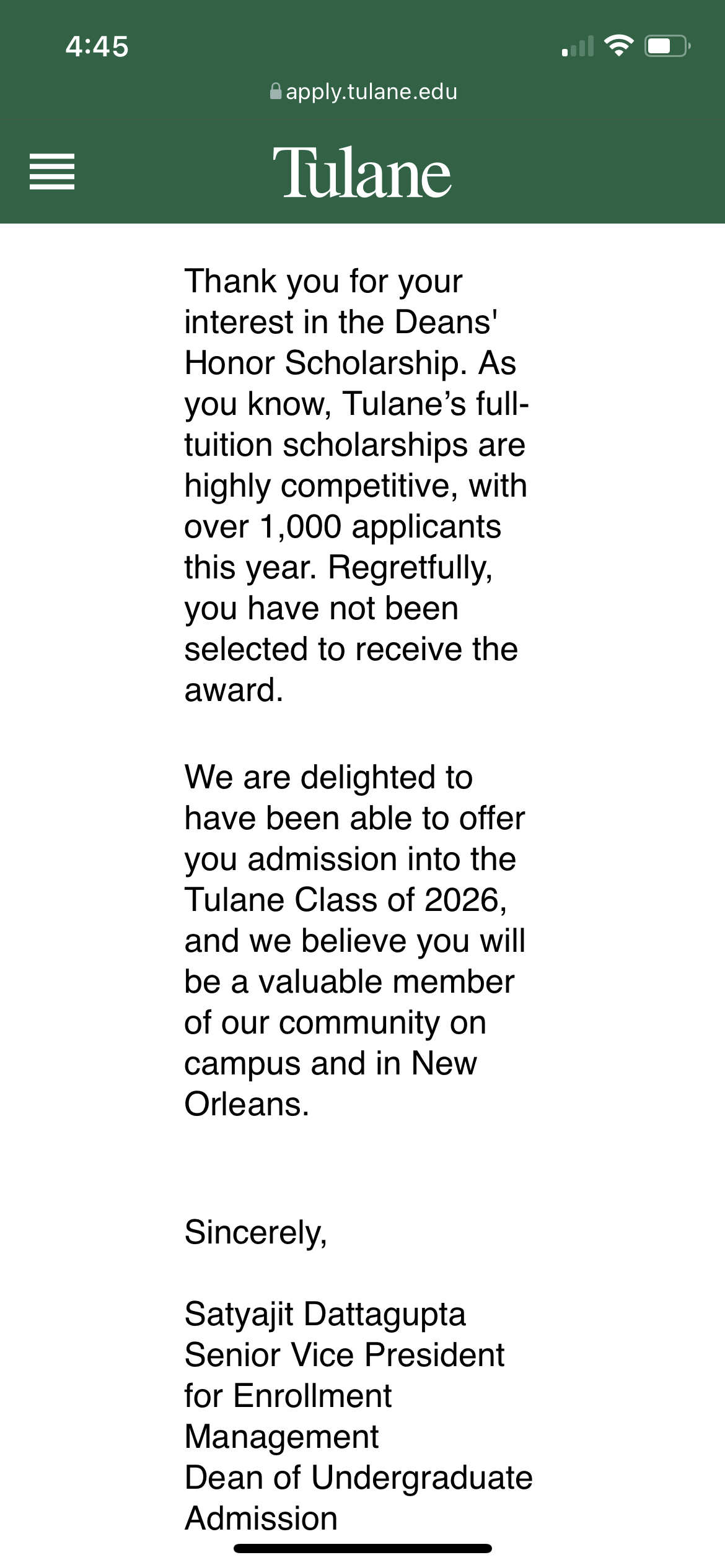 Our daughter was not awarded a scholarship. Her merit scholarship increased quite a bit per year, but ultimately she has a full ride offer one place and a full tuition at UMiami. So, I’m not sure we can make Tulane happen with those other options :(. I was really hoping she would be awarded one of the scholarships.