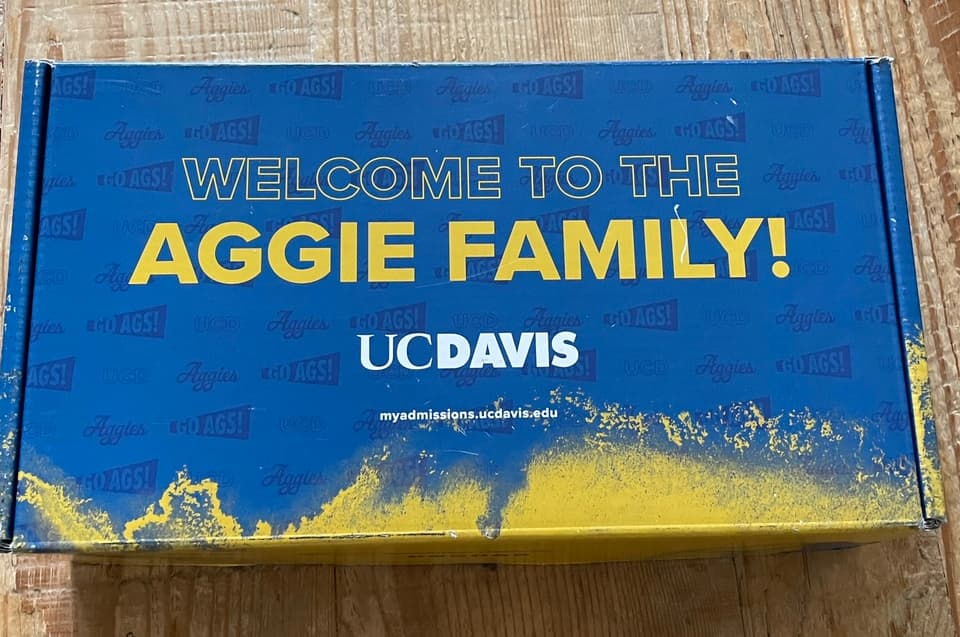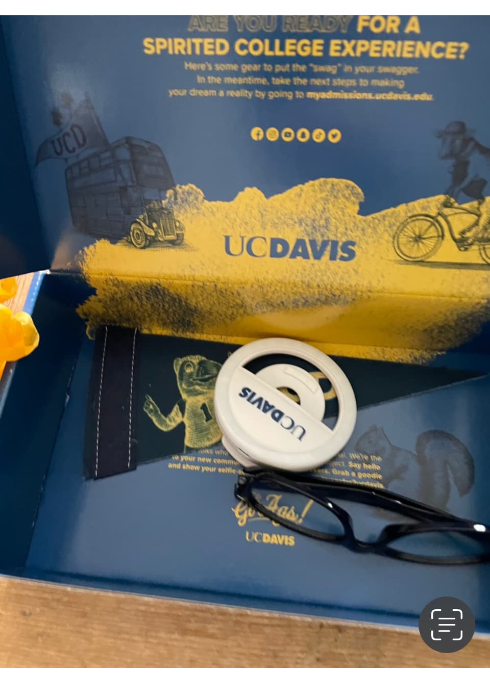 Here are some photos. My DS had not committed at the time he received the box. I believe he had already registered for Aggie Day- which was fabulous btw. Several items are missing from the box because DS was so excited he quickly grabbed them out of the box and put them to use. He is looking forward to studying CS at UCD.