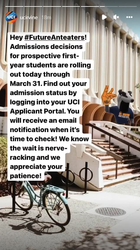 uci posted on Instagram that they’re doing rolling admissions to the end of March