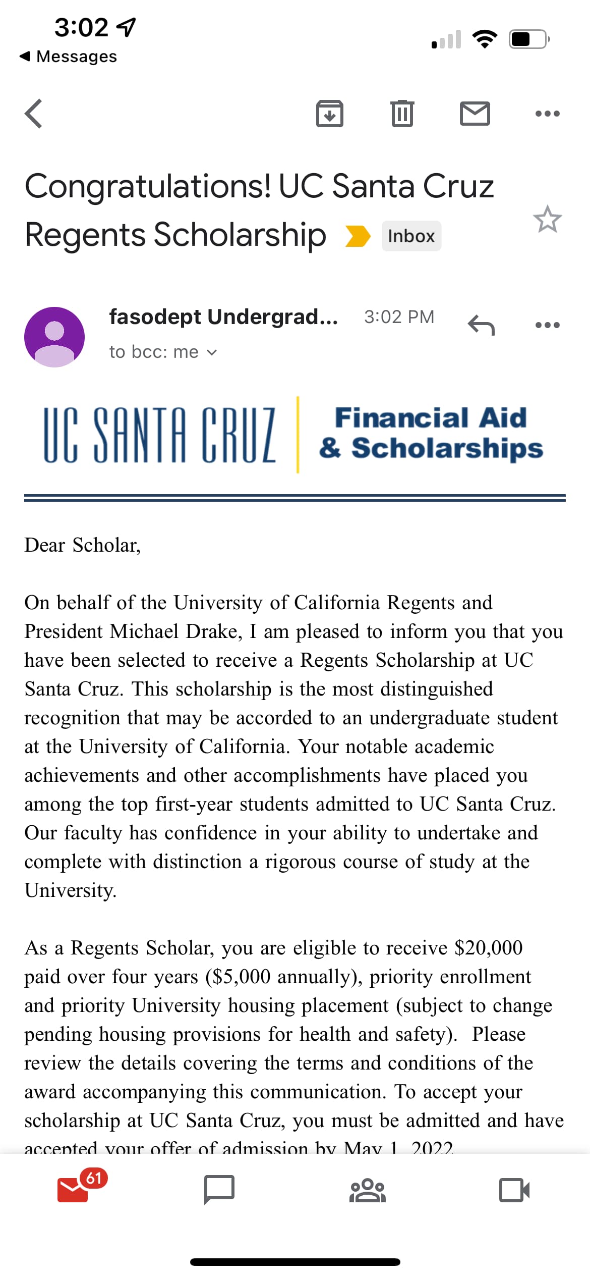 Ditto to poster above. D22 got offered the exact same scholarship today. Maybe UCSC is making an effort to land these students and not lose them to other high profile UCs perhaps. Dont know the reason but that was a very gratifying email for we as parents more than my D to read. D does not know or appreciate it fully but this was hard earned recognition and since my D dint factor money into the equation while applying to colleges and so this a kind of validation for all the hardwork we saw her put in.