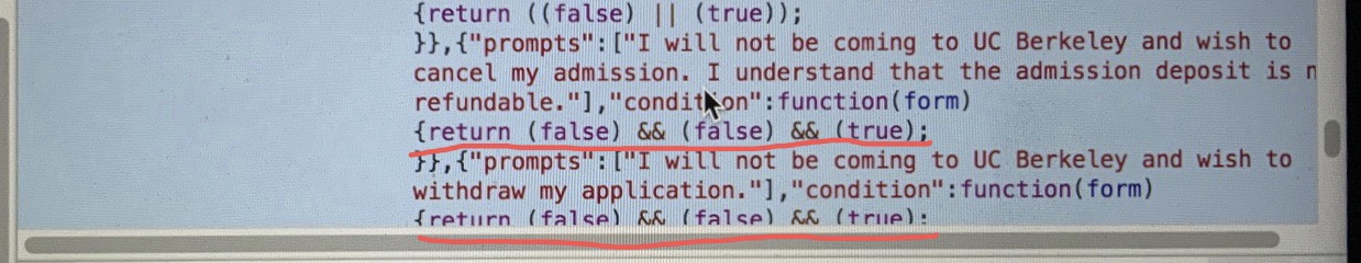 All other messages have different return, but these two have the same, the first one is for enrolled students, so I assume the second message “I will not be coming to UC Berkeley and wish to withdraw my application” means you are admitted.