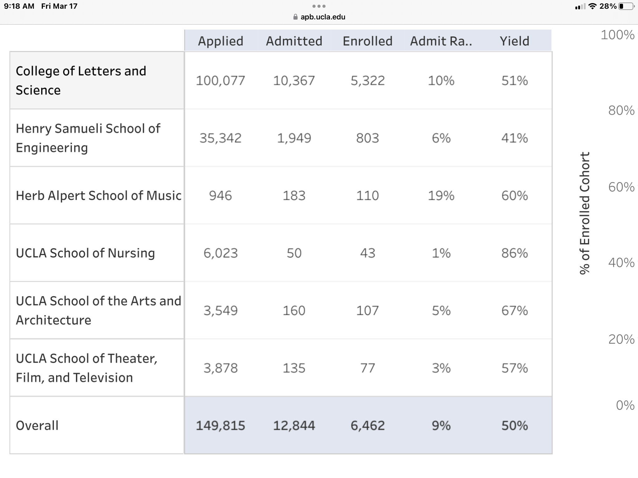 Here is a screenshot of the # of applicants, admits, enrolled and yield by UCLA college.
