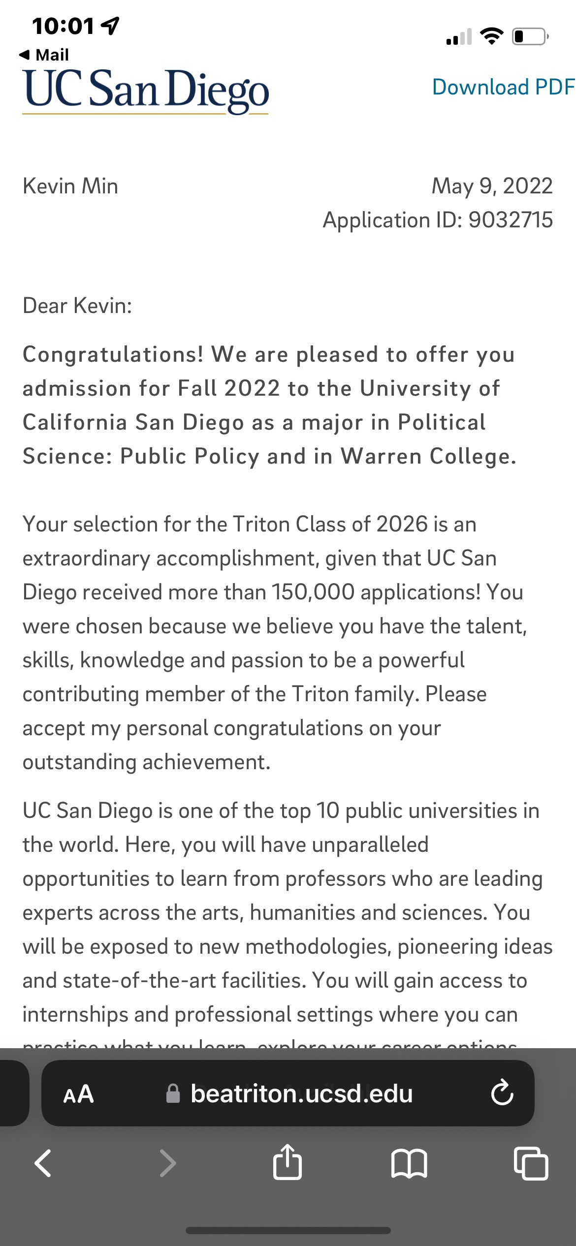 Daughter accepted for Interdisciplinary Computing and the Arts (first choice major) and Muir (first choice college). SD is not at the top of her list, but it’s the first UC to take her off the waitlist (still waiting on Davis, SC, SB). She already committed to Long Beach (Industrial Design). UCSD has more “prestige” but ICAM is a weird major, and the ID program at CSULB looks really good. Tough choice.