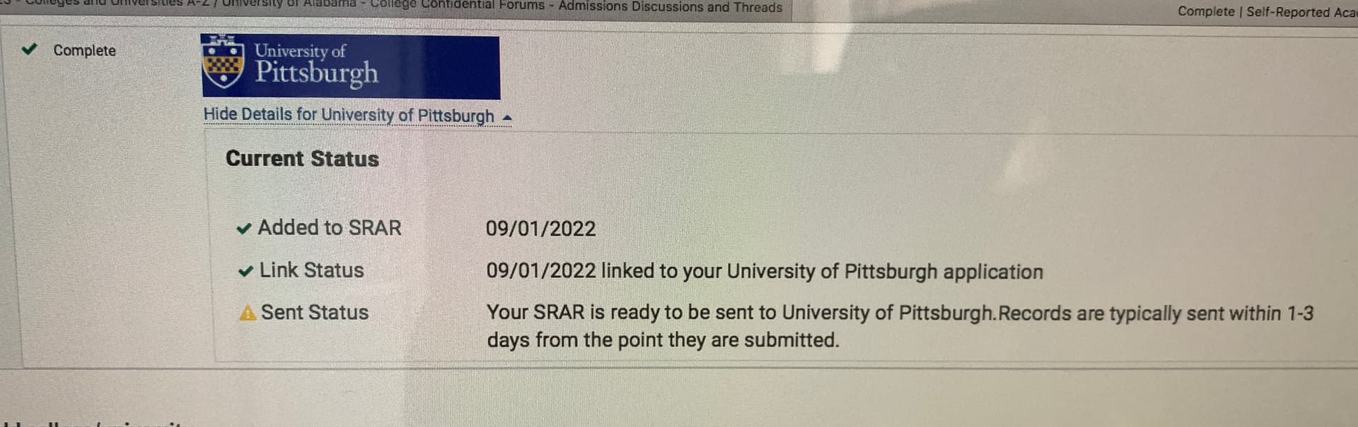 Did you submit to send it on the SRAR site? It can be complete by the student and Pitt marked as a destination, but you have to submit/locked to actually send it.