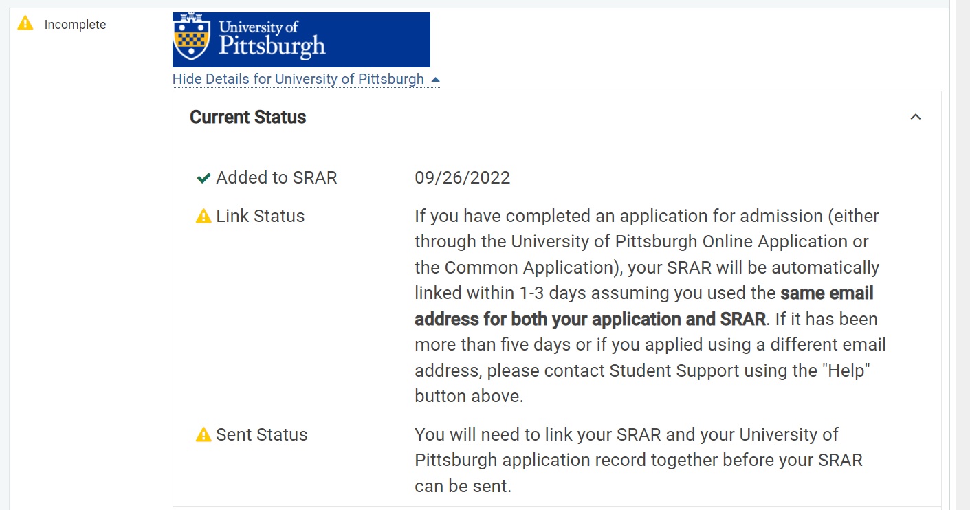 I see this on my SRAR. Any advise what this means, before my submit my SRAR to upitt? I am using the same email id with SRAR as with commonApp and the upitt portal.