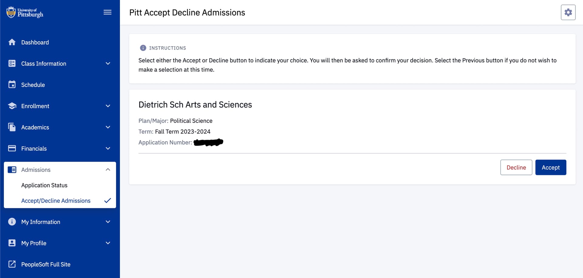 Application status says application complete. Letter in document center saying he got in to Pitt Johnstown. They couldnât offer him admit to main campus
