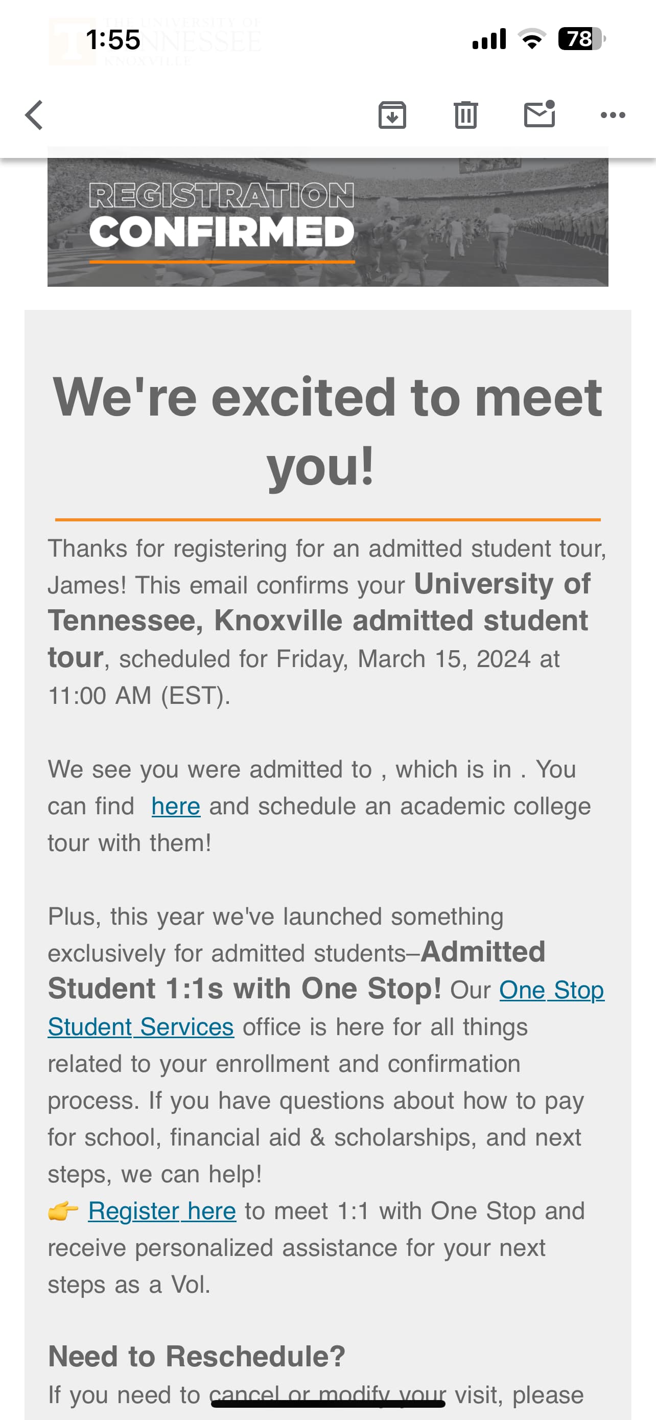 So I just did the admitted tour rather than New Vol Day and got the same message that everyone else seems to be seeing. The email says “ We see you were admitted to Business Analytics, which is in The Haslam College of Business.” This is her 1st choice major. Yay…hope this is a good sign!