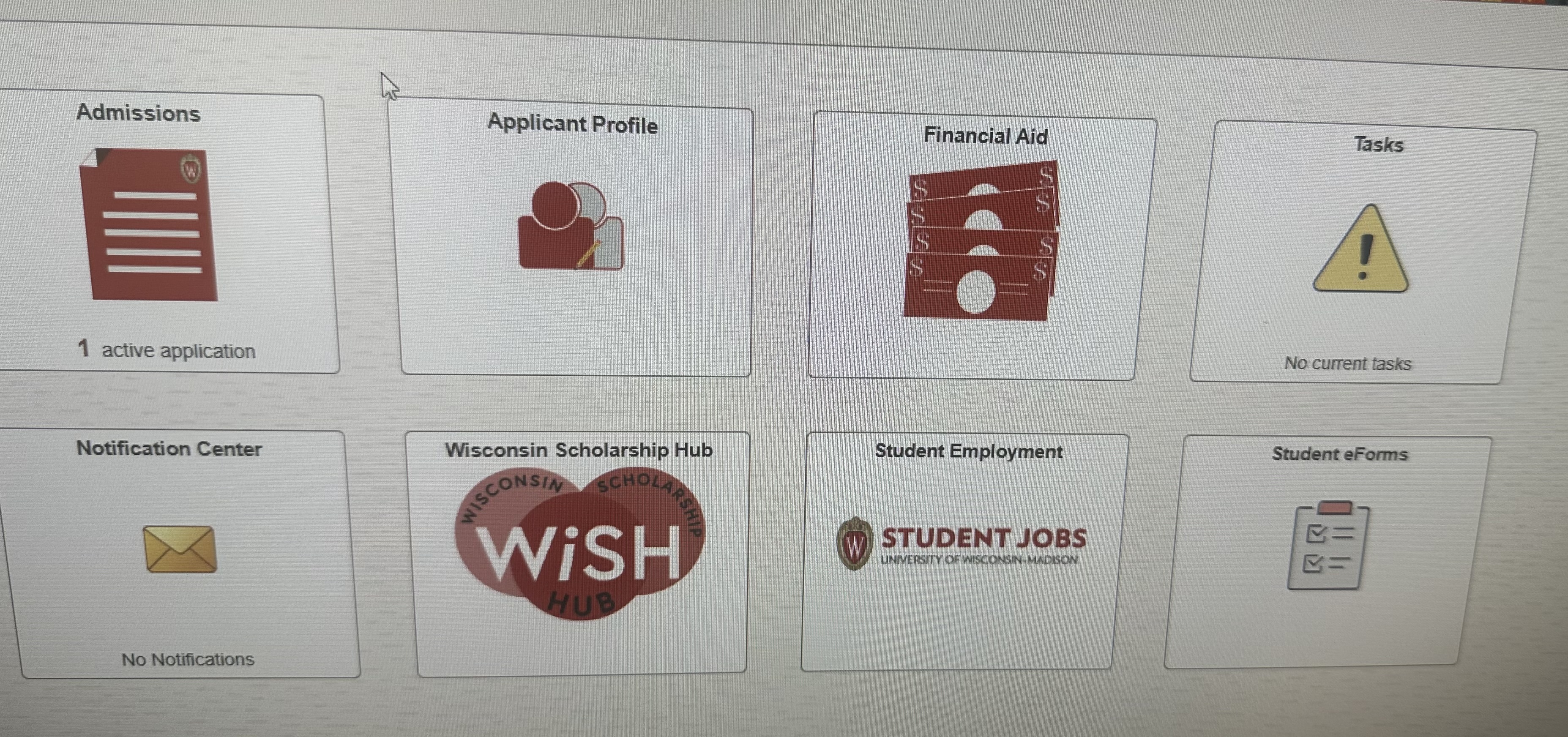 He has 8 boxes on applicant homepage only. He doesn’t have academic records as an option at all. He has Admissions, Applicant profile, Financial Aid, Tasks, Notification Center, Wisconsin Scholarship Hub, Student Employment and Student eForms.