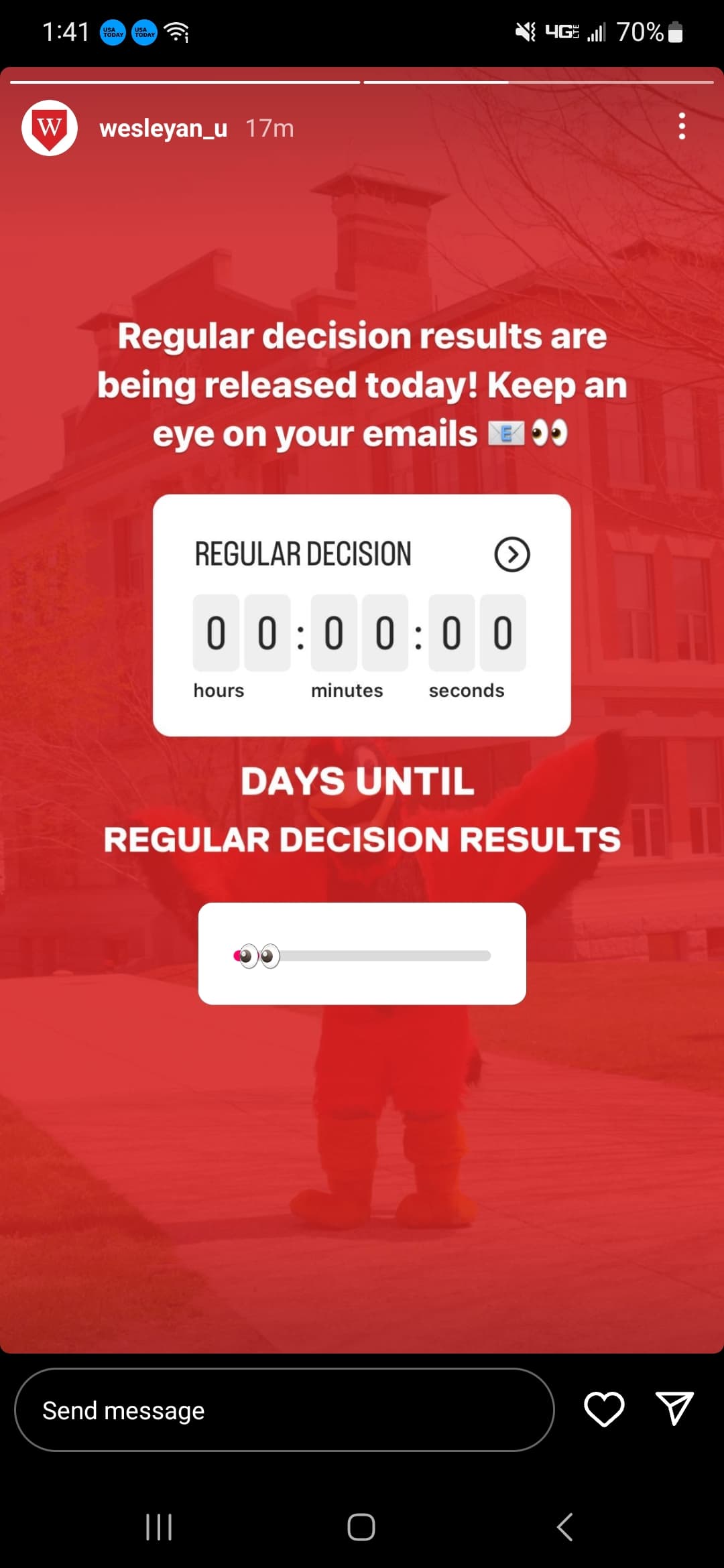 Good luck tomorrow, everyone! Remember that this year is absolutely insanely competitive across the board. I know so many bright, accomplished students who are been rejected and waitlisted at so many schools. My daughter just got rejected by Northwestern, and we’re not optimistic about Wesleyan now, but hopeful.